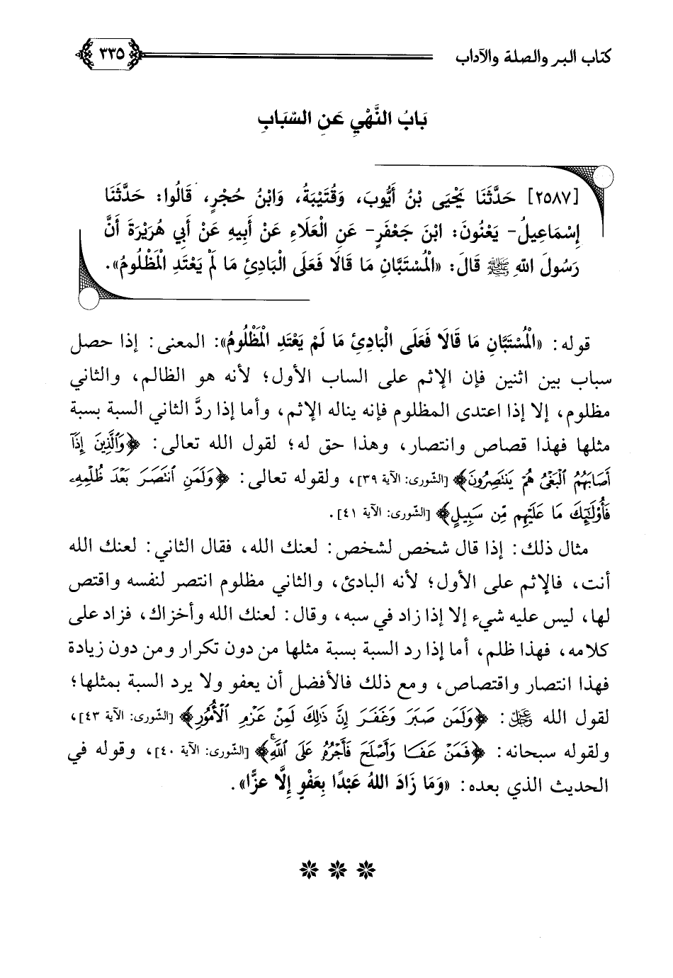 [٢٥٨٧] حَدَّثَنَا يَحْيَى بْنُ أَيُّوبَ، وَقُتَيْبَةُ، وَابْنُ حُجْرٍ، قَالُوا: حَدَّثَنَا إِسْمَاعِيلُ- يَعْنُونَ: ابْنَ جَعْفَرٍ- عَنِ الْعَلَاءِ عَنْ أَبِيهِ عَنْ أَبِي هُرَيْرَةَ أَنَّ رَسُولَ اللَّهِ صلى الله عليه وسلم قَالَ: ((الْمُسْتَبَّانِ مَا قَالَا فَعَلَى الْبَادِئِ مَا لَمْ يَعْتَدِ الْمَظْلُومُ)).