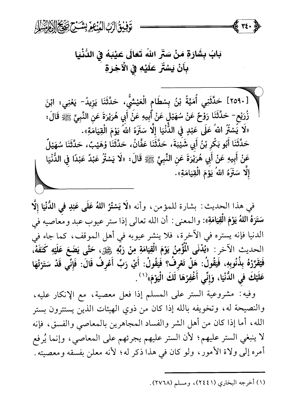 [٢٥٩٠] حَدَّثَنِي أُمَيَّةُ بْنُ بِسْطَامٍ الْعَيْشِيُّ، حَدَّثَنَا يَزِيدُ- يَعْنِي: ابْنَ زُرَيْعٍ- حَدَّثَنَا رَوْحٌ عَنْ سُهَيْلٍ عَنْ أَبِيهِ عَنْ أَبِي هُرَيْرَةَ عَنِ النَّبِيِّ صلى الله عليه وسلم قَالَ: ((لَا يَسْتُرُ اللَّهُ عَلَى عَبْدٍ فِي الدُّنْيَا إِلَّا سَتَرَهُ اللَّهُ يَوْمَ الْقِيَامَةِ)).