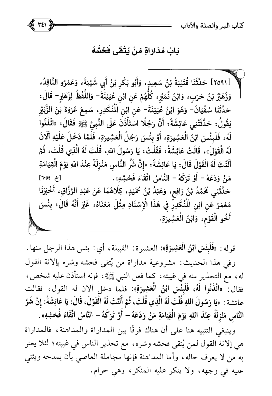 [٢٥٩١] حَدَّثَنَا قُتَيْبَةُ بْنُ سَعِيدٍ، وَأَبُو بَكْرِ بْنُ أَبِي شَيْبَةَ، وَعَمْرٌو النَّاقِدُ، وَزُهَيْرُ بْنُ حَرْبٍ، وَابْنُ نُمَيْرٍ، كُلُّهُمْ عَنِ ابْنِ عُيَيْنَةَ- وَاللَّفْظُ لِزُهَيْرٍ- قَالَ: حَدَّثَنَا سُفْيَانُ- وَهُوَ ابْنُ عُيَيْنَةَ- عَنِ ابْنِ الْمُنْكَدِرِ، سَمِعَ عُرْوَةَ بْنَ الزُّبَيْرِ يَقُولُ: حَدَّثَتْنِي عَائِشَةُ: أَنَّ رَجُلًا اسْتَأْذَنَ عَلَى النَّبِيِّ صلى الله عليه وسلم فَقَالَ: ((ائْذَنُوا لَهُ، فَلَبِئْسَ ابْنُ الْعَشِيرَةِ، أَوْ بِئْسَ رَجُلُ الْعَشِيرَةِ، فَلَمَّا دَخَلَ عَلَيْهِ أَلَانَ لَهُ الْقَوْلَ))، قَالَتْ عَائِشَةُ: فَقُلْتُ: يَا رَسُولَ اللَّهِ، قُلْتَ لَهُ الَّذِي قُلْتَ، ثُمَّ أَلَنْتَ لَهُ الْقَوْلَ قَالَ: يَا عَائِشَةُ: ((إِنَّ شَرَّ النَّاسِ مَنْزِلَةً عِنْدَ اللَّهِ يَوْمَ الْقِيَامَةِ مَنْ وَدَعَهُ، أَوْ تَرَكَهُ النَّاسُ اتِّقَاءَ فُحْشِهِ)).