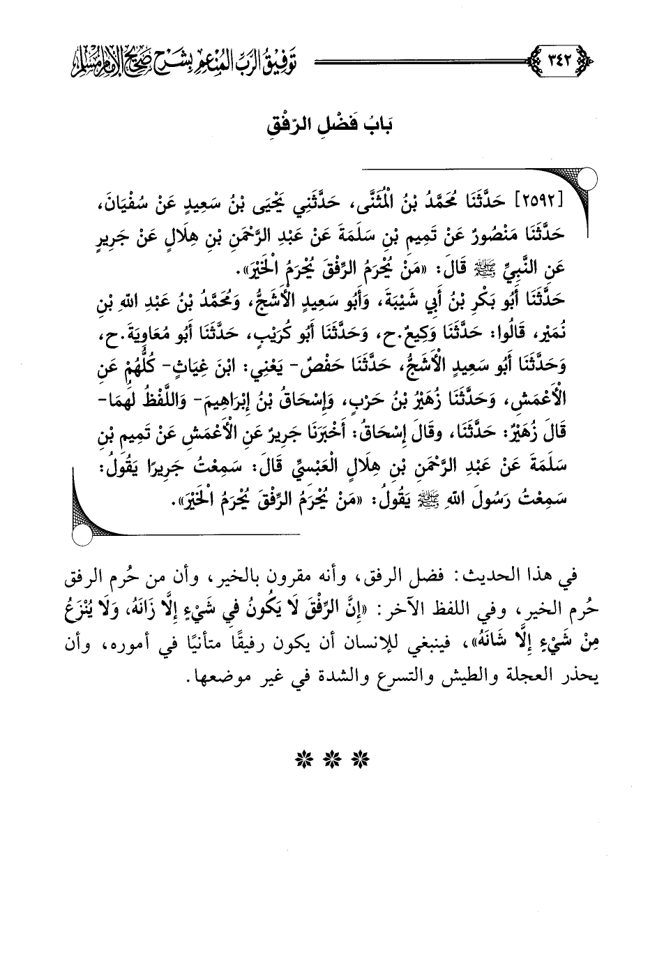 [٢٥٩٢] حَدَّثَنَا مُحَمَّدُ بْنُ الْمُثَنَّى، حَدَّثَنِي يَحْيَى بْنُ سَعِيدٍ عَنْ سُفْيَانَ، حَدَّثَنَا مَنْصُورٌ عَنْ تَمِيمِ بْنِ سَلَمَةَ عَنْ عَبْدِ الرَّحْمَنِ بْنِ هِلَالٍ عَنْ جَرِيرٍ عَنِ النَّبِيِّ صلى الله عليه وسلم قَالَ: ((مَنْ يُحْرَمُ الرِّفْقَ يُحْرَمُ الْخَيْرَ)).