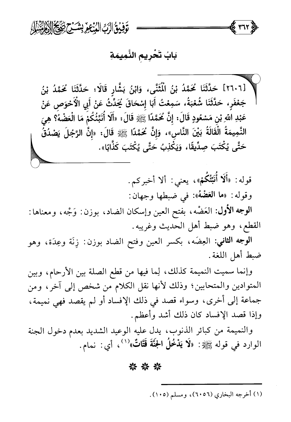 [٢٦٠٦] حَدَّثَنَا مُحَمَّدُ بْنُ الْمُثَنَّى، وَابْنُ بَشَّارٍ قَالَا: حَدَّثَنَا مُحَمَّدُ بْنُ جَعْفَرٍ، حَدَّثَنَا شُعْبَةُ، سَمِعْتُ أَبَا إِسْحَاقَ يُحَدِّثُ عَنْ أَبِي الْأَحْوَصِ عَنْ عَبْدِ اللَّهِ بْنِ مَسْعُودٍ قَالَ: إِنَّ مُحَمَّدًا صلى الله عليه وسلم قَالَ: ((أَلَا أُنَبِّئُكُمْ مَا الْعَضْهُ؟ هِيَ النَّمِيمَةُ الْقَالَةُ بَيْنَ النَّاسِ))، وَإِنَّ مُحَمَّدًا صلى الله عليه وسلم قَالَ: ((إِنَّ الرَّجُلَ يَصْدُقُ حَتَّى يُكْتَبَ صِدِّيقًا، وَيَكْذِبُ حَتَّى يُكْتَبَ كَذَّابًا)).
