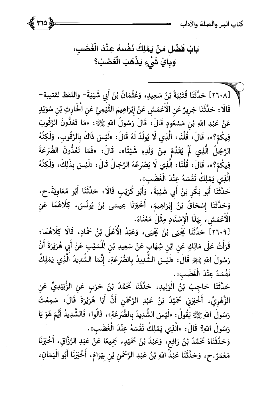 [٢٦٠٩] حَدَّثَنَا يَحْيَى بْنُ يَحْيَى، وَعَبْدُ الْأَعْلَى بْنُ حَمَّادٍ، قَالَا كِلَاهُمَا: قَرَأْتُ عَلَى مَالِكٍ عَنِ ابْنِ شِهَابٍ عَنْ سَعِيدِ بْنِ الْمُسَيِّبِ عَنْ أَبِي هُرَيْرَةَ أَنَّ رَسُولَ اللَّهِ صلى الله عليه وسلم قَالَ: ((لَيْسَ الشَّدِيدُ بِالصُّرَعَةِ، إِنَّمَا الشَّدِيدُ الَّذِي يَمْلِكُ نَفْسَهُ عِنْدَ الْغَضَبِ)).