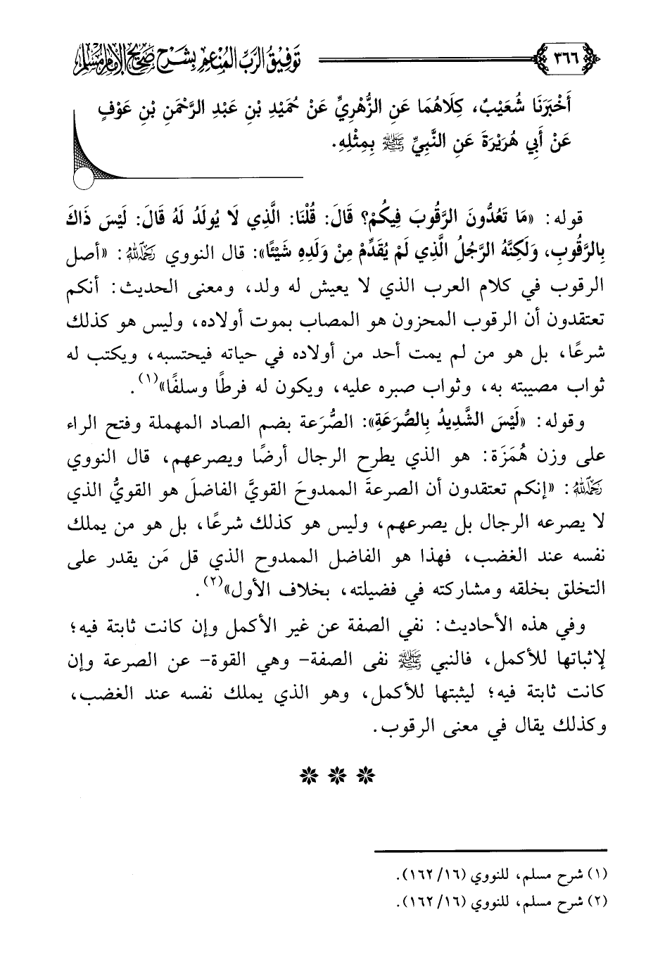 وفي هذه الأحاديث: نفي الصفة عن غير الأكمل وإن كانت ثابتة فيه؛ لإثباتها للأكمل، فالنبي صلى الله عليه وسلم نفى الصفة- وهي القوة- عن الصرعة وإن كانت ثابتة فيه؛ ليثبتها للأكمل، وهو الذي يملك نفسه عند الغضب، وكذلك يقال في معنى الرقوب.