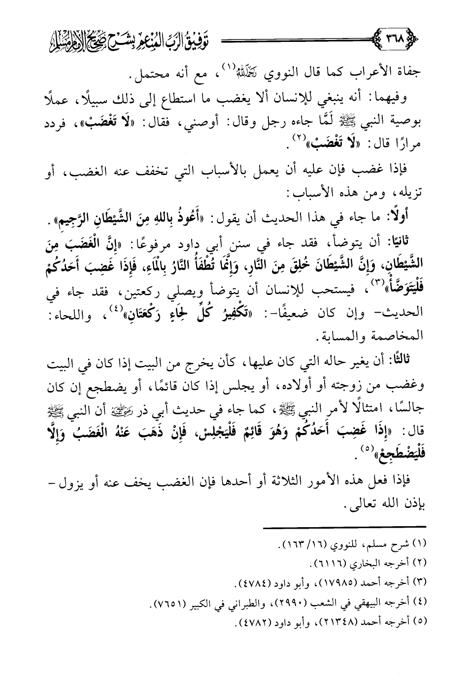 ثانيًا: أن يتوضأ، فقد جاء في سنن أبي داود مرفوعًا: ((إِنَّ الْغَضَبَ مِنَ الشَّيْطَانِ، وَإِنَّ الشَّيْطَانَ خُلِقَ مِنَ النَّارِ، وَإِنَّمَا تُطْفَأُ النَّارُ بِالْمَاءِ، فَإِذَا غَضِبَ أَحَدُكُمْ فَلْيَتَوَضَّأْ)) (¬٣)، فيستحب للإنسان أن يتوضأ ويصلي ركعتين، فقد جاء في الحديث- وإن كان ضعيفًا-: ((تَكْفِيرُ كُلِّ لِحَاءٍ رَكْعَتَانِ)) (¬٤)، واللحاء: المخاصمة والمسابة.