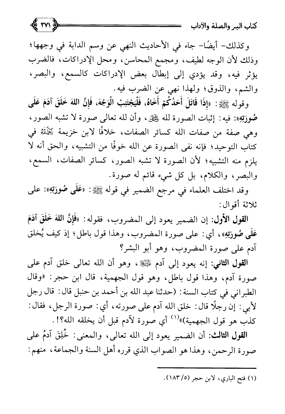 وقوله صلى الله عليه وسلم: ((إِذَا قَاتَلَ أَحَدُكُمْ أَخَاهُ، فَلْيَجْتَنِبْ الْوَجْهَ، فَإِنَّ اللَّهَ خَلَقَ آدَمَ عَلَى صُورَتِهِ)): فيه إثبات الصورة لله عز وجل، وأن لله تعالى صورة لا تشبه الصور، وهي صفة من صفات الله كسائر الصفات، خلافًا لابن خزيمة رحمه الله في كتاب التوحيد؛ فإنه نفى الصورة عن الله خوفًا من التشبيه، والحق أنه لا يلزم منه التشبيه؛ لأن الصورة لا تشبه الصور، كسائر الصفات، السمع، والبصر، والكلام، بل كل شيء قائم له صورة.
