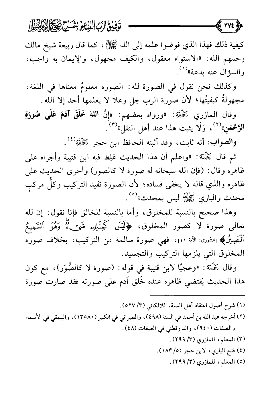ثم قال رحمه الله: ((واعلم أن هذا الحديث غلِط فيه ابن قتيبة وأجراه على ظاهره (وقال: فإن الله سبحانه له صورة لا كالصور وأجرى الحديث على ظاهره والذي قاله لا يخفى فساده؛ لأن الصورة تفيد التركيب وكلّ مركبٍ محدث والباري سبحانه وتعالى ليس بمحدث)) (¬٥).