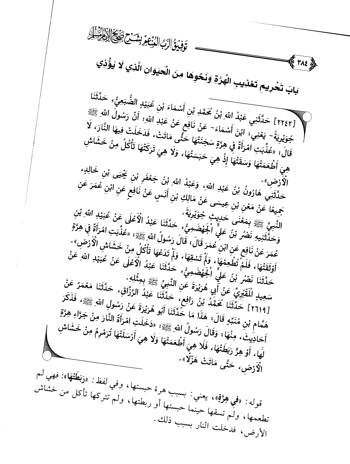 [٢٦١٩] حَدَّثَنَا مُحَمَّدُ بْنُ رَافِعٍ، حَدَّثَنَا عَبْدُ الرَّزَّاقِ، حَدَّثَنَا مَعْمَرٌ عَنْ هَمَّامِ بْنِ مُنَبِّهٍ قَالَ: هَذَا مَا حَدَّثَنَا أَبُو هُرَيْرَةَ عَنْ رَسُولِ اللَّهِ صلى الله عليه وسلم، فَذَكَرَ أَحَادِيثَ، مِنْهَا: وَقَالَ رَسُولُ اللَّهِ صلى الله عليه وسلم: ((دَخَلَتِ امْرَأَةٌ النَّارَ مِنْ جَرَّاءِ هِرَّةٍ لَهَا، أَوْ هِرٍّ رَبَطَتْهَا، فَلَا هِيَ أَطْعَمَتْهَا وَلَا هِيَ أَرْسَلَتْهَا تُرَمْرِمُ مِنْ خَشَاشِ الْأَرْضِ، حَتَّى مَاتَتْ هَزْلًا)).
