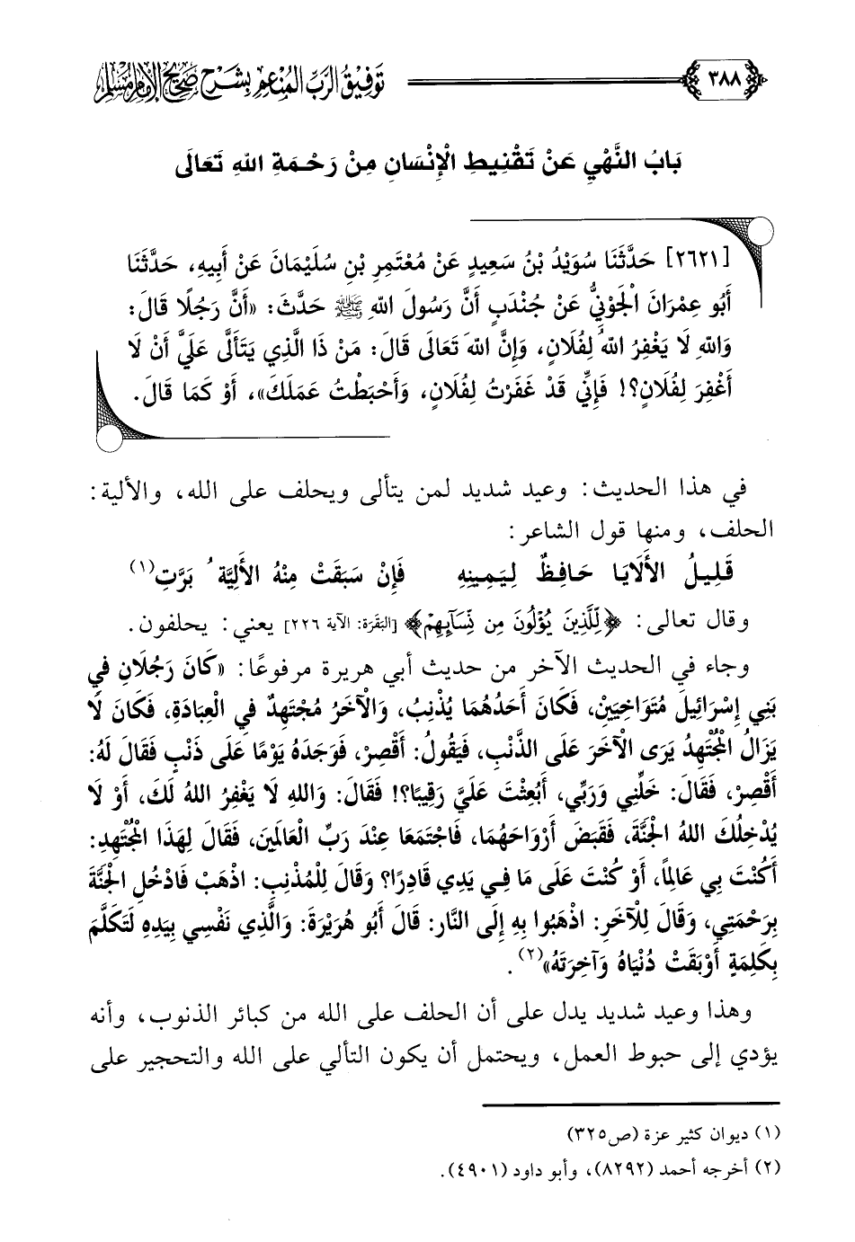 [٢٦٢١] حَدَّثَنَا سُوَيْدُ بْنُ سَعِيدٍ عَنْ مُعْتَمِرِ بْنِ سُلَيْمَانَ عَنْ أَبِيهِ، حَدَّثَنَا أَبُو عِمْرَانَ الْجَوْنِيُّ عَنْ جُنْدَبٍ أَنَّ رَسُولَ اللَّهِ صلى الله عليه وسلم حَدَّثَ: ((أَنَّ رَجُلًا قَالَ: وَاللَّهِ لَا يَغْفِرُ اللَّهُ لِفُلَانٍ، وَإِنَّ اللَّهَ تَعَالَى قَالَ: مَنْ ذَا الَّذِي يَتَأَلَّى عَلَيَّ أَنْ لَا أَغْفِرَ لِفُلَانٍ؟ ! فَإِنِّي قَدْ غَفَرْتُ لِفُلَانٍ، وَأَحْبَطْتُ عَمَلَكَ))، أَوْ كَمَا قَالَ.