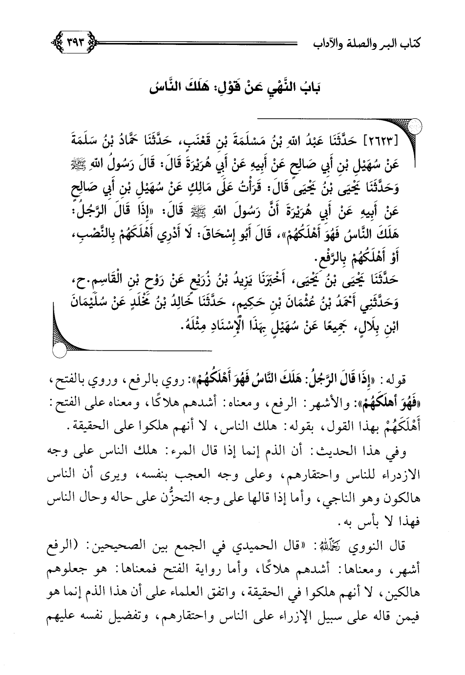 [٢٦٢٣] حَدَّثَنَا عَبْدُ اللَّهِ بْنُ مَسْلَمَةَ بْنِ قَعْنَبٍ، حَدَّثَنَا حَمَّادُ بْنُ سَلَمَةَ عَنْ سُهَيْلِ بْنِ أَبِي صَالِحٍ عَنْ أَبِيهِ عَنْ أَبِي هُرَيْرَةَ قَالَ: قَالَ رَسُولُ اللَّهِ صلى الله عليه وسلم وَحَدَّثَنَا يَحْيَى بْنُ يَحْيَى قَالَ: قَرَأْتُ عَلَى مَالِكٍ عَنْ سُهَيْلِ بْنِ أَبِي صَالِحٍ عَنْ أَبِيهِ عَنْ أَبِي هُرَيْرَةَ أَنَّ رَسُولَ اللَّهِ صلى الله عليه وسلم قَالَ: ((إِذَا قَالَ الرَّجُلُ: هَلَكَ النَّاسُ فَهُوَ أَهْلَكُهُمْ))، قَالَ أَبُو إِسْحَاقَ: لَا أَدْرِي أَهْلَكَهُمْ بِالنَّصْبِ، أَوْ أَهْلَكُهُمْ بِالرَّفْعِ.