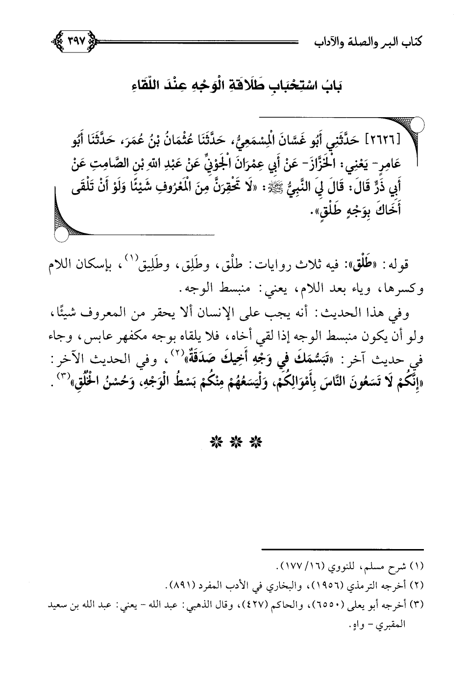 [٢٦٢٦] حَدَّثَنِي أَبُو غَسَّانَ الْمِسْمَعِيُّ، حَدَّثَنَا عُثْمَانُ بْنُ عُمَرَ، حَدَّثَنَا أَبُو عَامِرٍ- يَعْنِي: الْخَزَّازَ- عَنْ أَبِي عِمْرَانَ الْجَوْنِيِّ عَنْ عَبْدِ اللَّهِ بْنِ الصَّامِتِ عَنْ أَبِي ذَرٍّ قَالَ: قَالَ لِيَ النَّبِيُّ صلى الله عليه وسلم: ((لَا تَحْقِرَنَّ مِنَ الْمَعْرُوفِ شَيْئًا وَلَوْ أَنْ تَلْقَى أَخَاكَ بِوَجْهٍ طَلْقٍ)).