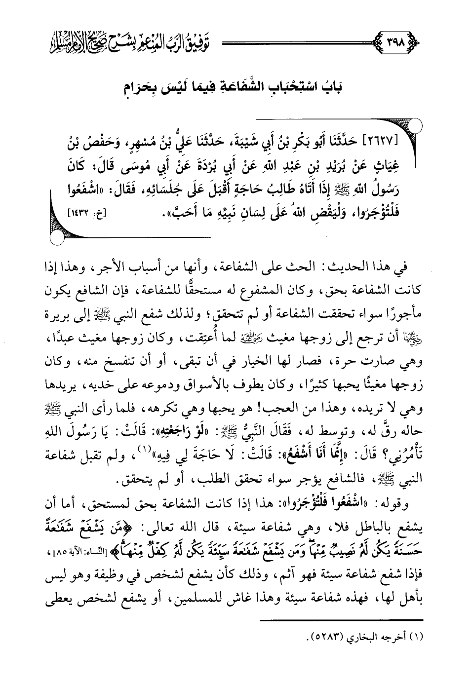 في هذا الحديث: الحث على الشفاعة، وأنها من أسباب الأجر، وهذا إذا كانت الشفاعة بحق، وكان المشفوع له مستحقًّا للشفاعة، فإن الشافع يكون مأجورًا سواء تحققت الشفاعة أو لم تتحقق؛ ولذلك شفع النبي صلى الله عليه وسلم إلى بريرة رضي الله عنها أن ترجع إلى زوجها مغيث رضي الله عنه لما أُعتِقت، وكان زوجها مغيث عبدًا، وهي صارت حرة، فصار لها الخيار في أن تبقى، أو أن تنفسخ منه، وكان زوجها مغيثًا يحبها كثيرًا، وكان يطوف بالأسواق ودموعه على خديه، يريدها وهي لا تريده، وهذا من العجب! هو يحبها وهي تكرهه، فلما رأى النبي صلى الله عليه وسلم حاله رقَّ له، وتوسط له، فَقَالَ النَّبِيُّ صَلَّى اللهُ عَلَيْهِ وَسَلَّمَ: ((لَوْ رَاجَعْتِهِ)): قَالَتْ: يَا رَسُولَ اللَّهِ تَأْمُرُنِي؟ قَالَ: ((إِنَّمَا أَنَا أَشْفَعُ)): قَالَتْ: لا حَاجَةَ لِي فِيهِ)) (¬١)، ولم تقبل شفاعة النبي صلى الله عليه وسلم، فالشافع يؤجر سواء تحقق الطلب، أو لم يتحقق.