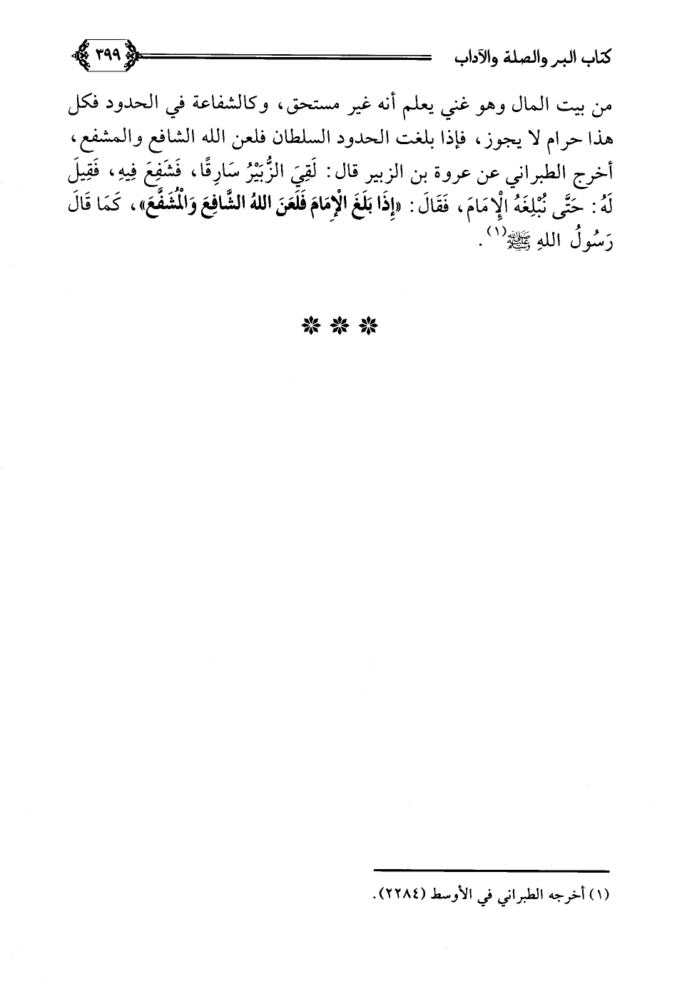 من بيت المال وهو غني يعلم أنه غير مستحق، وكالشفاعة في الحدود فكل هذا حرام لا يجوز، فإذا بلغت الحدود السلطان فلعن الله الشافع والمشفع، أخرج الطبراني عن عروة بن الزبير قال: ((لَقِيَ الزُّبَيْرُ سَارِقًا، فَشَفِعَ فِيهِ، فَقِيلَ لَهُ: حَتَّى نُبْلِغَهُ الْإِمَامَ، فَقَالَ: «إِذَا بَلَغَ الْإِمَامَ فَلَعَنَ اللَّهُ الشَّافِعَ وَالْمُشَفَّعَ، كَمَا قَالَ رَسُولُ اللَّهِ صلى الله عليه وسلم)) (¬١).