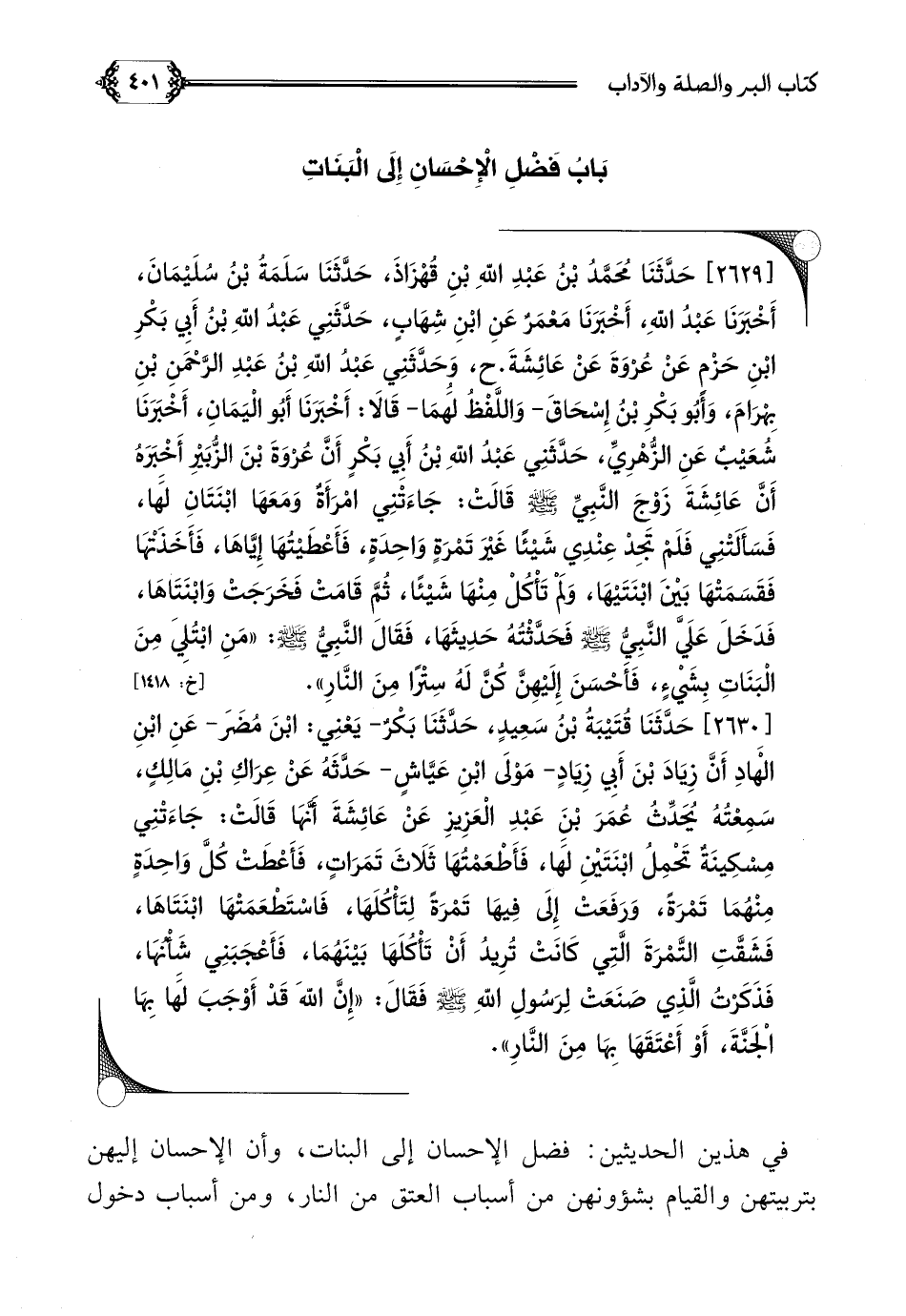 [٢٦٢٩] حَدَّثَنَا مُحَمَّدُ بْنُ عَبْدِ اللَّهِ بْنِ قُهْزَاذَ، حَدَّثَنَا سَلَمَةُ بْنُ سُلَيْمَانَ، أَخْبَرَنَا عَبْدُ اللَّهِ، أَخْبَرَنَا مَعْمَرٌ عَنِ ابْنِ شِهَابٍ، حَدَّثَنِي عَبْدُ اللَّهِ بْنُ أَبِي بَكْرِ بْنِ حَزْمٍ عَنْ عُرْوَةَ عَنْ عَائِشَةَ. ح، وَحَدَّثَنِي عَبْدُ اللَّهِ بْنُ عَبْدِ الرَّحْمَنِ بْنِ بِهْرَامَ، وَأَبُو بَكْرِ بْنُ إِسْحَاقَ- وَاللَّفْظُ لَهُمَا- قَالَا: أَخْبَرَنَا أَبُو الْيَمَانِ، أَخْبَرَنَا شُعَيْبٌ عَنِ الزُّهْرِيِّ، حَدَّثَنِي عَبْدُ اللَّهِ بْنُ أَبِي بَكْرٍ أَنَّ عُرْوَةَ بْنَ الزُّبَيْرِ أَخْبَرَهُ أَنَّ عَائِشَةَ زَوْجَ النَّبِيِّ صلى الله عليه وسلم قَالَتْ: جَاءَتْنِي امْرَأَةٌ وَمَعَهَا ابْنَتَانِ لَهَا، فَسَأَلَتْنِي فَلَمْ تَجِدْ عِنْدِي شَيْئًا غَيْرَ تَمْرَةٍ وَاحِدَةٍ، فَأَعْطَيْتُهَا إِيَّاهَا، فَأَخَذَتْهَا فَقَسَمَتْهَا بَيْنَ ابْنَتَيْهَا، وَلَمْ تَأْكُلْ مِنْهَا شَيْئًا، ثُمَّ قَامَتْ فَخَرَجَتْ وَابْنَتَاهَا، فَدَخَلَ عَلَيَّ النَّبِيُّ صلى الله عليه وسلم فَحَدَّثْتُهُ حَدِيثَهَا، فَقَالَ النَّبِيُّ صلى الله عليه وسلم: ((مَنِ ابْتُلِيَ مِنَ الْبَنَاتِ بِشَيْءٍ، فَأَحْسَنَ إِلَيْهِنَّ كُنَّ لَهُ سِتْرًا مِنَ النَّارِ)).