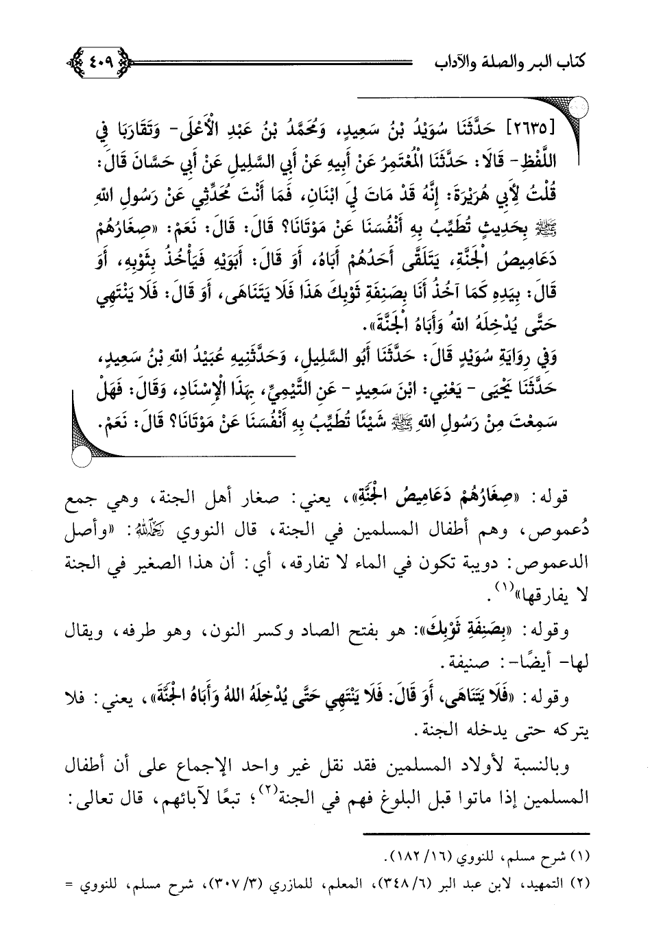 [٢٦٣٥] حَدَّثَنَا سُوَيْدُ بْنُ سَعِيدٍ، وَمُحَمَّدُ بْنُ عَبْدِ الْأَعْلَى- وَتَقَارَبَا فِي اللَّفْظِ- قَالَا: حَدَّثَنَا الْمُعْتَمِرُ عَنْ أَبِيهِ عَنْ أَبِي السَّلِيلِ عَنْ أَبِي حَسَّانَ قَالَ: قُلْتُ لِأَبِي هُرَيْرَةَ: إِنَّهُ قَدْ مَاتَ لِيَ ابْنَانِ، فَمَا أَنْتَ مُحَدِّثِي عَنْ رَسُولِ اللَّهِ صلى الله عليه وسلم بِحَدِيثٍ تُطَيِّبُ بِهِ أَنْفُسَنَا عَنْ مَوْتَانَا؟ قَالَ: قَالَ: نَعَمْ: ((صِغَارُهُمْ دَعَامِيصُ الْجَنَّةِ، يَتَلَقَّى أَحَدُهُمْ أَبَاهُ، أَوَ قَالَ: أَبَوَيْهِ فَيَأْخُذُ بِثَوْبِهِ، أَوَ قَالَ: بِيَدِهِ كَمَا آخُذُ أَنَا بِصَنِفَةِ ثَوْبِكَ هَذَا فَلَا يَتَنَاهَى، أَوَ قَالَ: فَلَا يَنْتَهِي حَتَّى يُدْخِلَهُ اللَّهُ وَأَبَاهُ الْجَنَّةَ)).