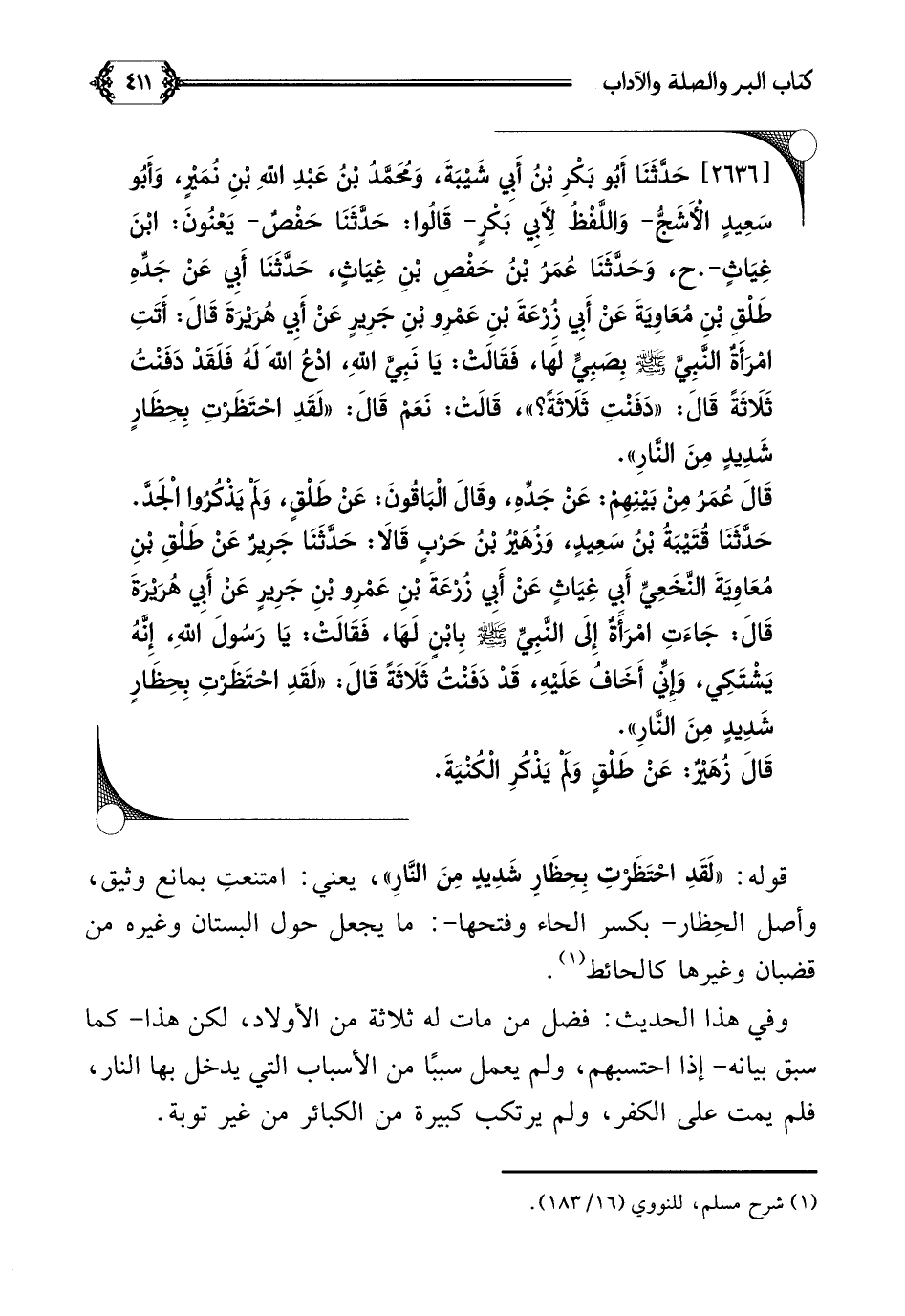[٢٦٣٦] حَدَّثَنَا أَبُو بَكْرِ بْنُ أَبِي شَيْبَةَ، وَمُحَمَّدُ بْنُ عَبْدِ اللَّهِ بْنِ نُمَيْرٍ، وَأَبُو سَعِيدٍ الْأَشَجُّ- وَاللَّفْظُ لِأَبِي بَكْرٍ- قَالُوا: حَدَّثَنَا حَفْصٌ- يَعْنُونَ: ابْنَ غِيَاثٍ-.ح، وَحَدَّثَنَا عُمَرُ بْنُ حَفْصِ بْنِ غِيَاثٍ، حَدَّثَنَا أَبِي عَنْ جَدِّهِ طَلْقِ بْنِ مُعَاوِيَةَ عَنْ أَبِي زُرْعَةَ بْنِ عَمْرِو بْنِ جَرِيرٍ عَنْ أَبِي هُرَيْرَةَ قَالَ: أَتَتِ امْرَأَةٌ النَّبِيَّ صلى الله عليه وسلم بِصَبِيٍّ لَهَا، فَقَالَتْ: يَا نَبِيَّ اللَّهِ، ادْعُ اللَّهَ لَهُ فَلَقَدْ دَفَنْتُ ثَلَاثَةً قَالَ: ((دَفَنْتِ ثَلَاثَةً؟ ))، قَالَتْ: نَعَمْ قَالَ: ((لَقَدِ احْتَظَرْتِ بِحِظَارٍ شَدِيدٍ مِنَ النَّارِ)).
