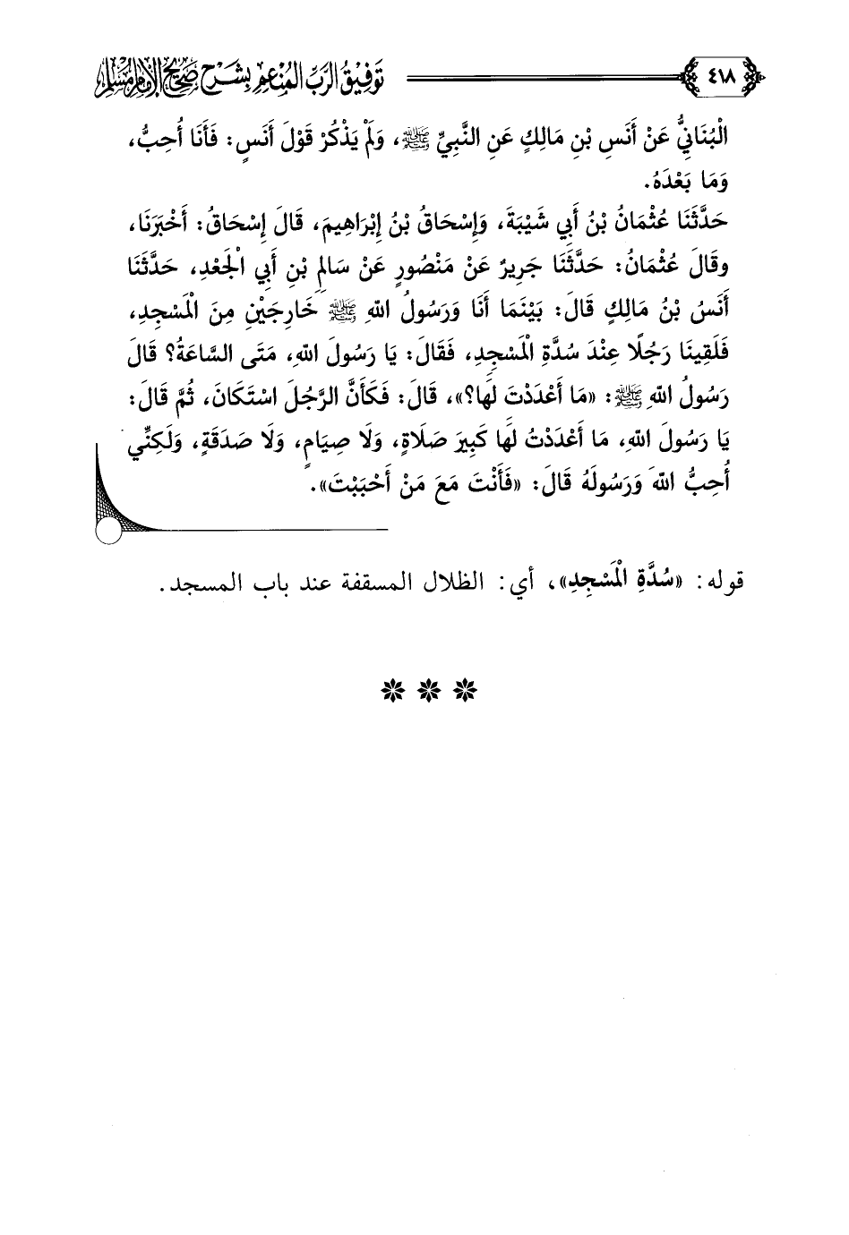 حَدَّثَنَا عُثْمَانُ بْنُ أَبِي شَيْبَةَ، وَإِسْحَاقُ بْنُ إِبْرَاهِيمَ، قَالَ إِسْحَاقُ: أَخْبَرَنَا، وقَالَ عُثْمَانُ: حَدَّثَنَا جَرِيرٌ عَنْ مَنْصُورٍ عَنْ سَالِمِ بْنِ أَبِي الْجَعْدِ، حَدَّثَنَا أَنَسُ بْنُ مَالِكٍ قَالَ: بَيْنَمَا أَنَا وَرَسُولُ اللَّهِ صلى الله عليه وسلم خَارِجَيْنِ مِنَ الْمَسْجِدِ، فَلَقِينَا رَجُلًا عِنْدَ سُدَّةِ الْمَسْجِدِ، فَقَالَ: يَا رَسُولَ اللَّهِ، مَتَى السَّاعَةُ؟ قَالَ رَسُولُ اللَّهِ صلى الله عليه وسلم: ((مَا أَعْدَدْتَ لَهَا؟ ))، قَالَ: فَكَأَنَّ الرَّجُلَ اسْتَكَانَ، ثُمَّ قَالَ: يَا رَسُولَ اللَّهِ، مَا أَعْدَدْتُ لَهَا كَبِيرَ صَلَاةٍ، وَلَا صِيَامٍ، وَلَا صَدَقَةٍ، وَلَكِنِّي أُحِبُّ اللَّهَ وَرَسُولَهُ قَالَ: ((فَأَنْتَ مَعَ مَنْ أَحْبَبْتَ)).