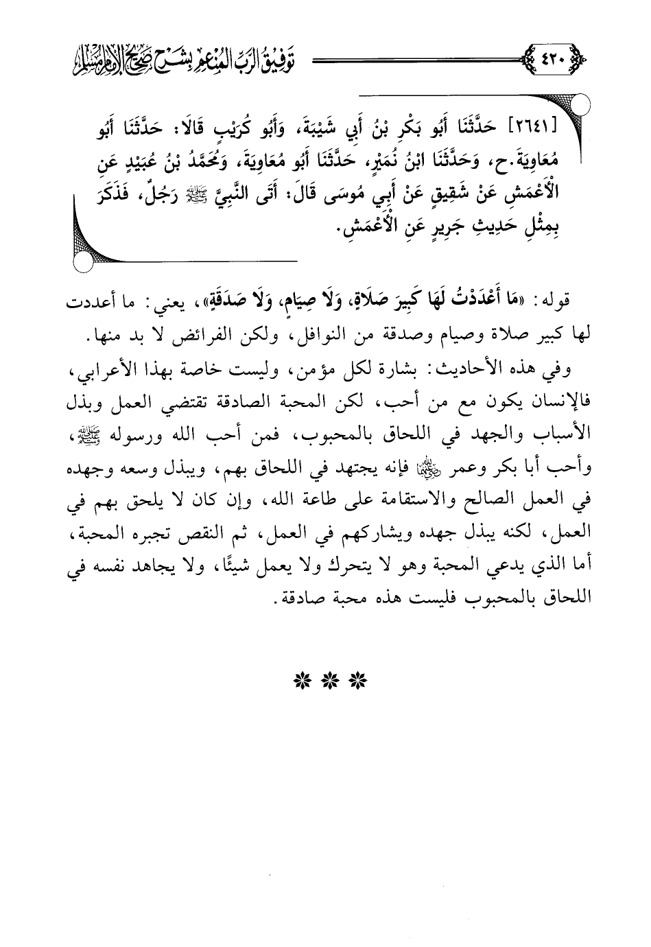 [٢٦٤١] حَدَّثَنَا أَبُو بَكْرِ بْنُ أَبِي شَيْبَةَ، وَأَبُو كُرَيْبٍ قَالَا: حَدَّثَنَا أَبُو مُعَاوِيَةَ. ح، وَحَدَّثَنَا ابْنُ نُمَيْرٍ، حَدَّثَنَا أَبُو مُعَاوِيَةَ، وَمُحَمَّدُ بْنُ عُبَيْدٍ عَنْ الْأَعْمَشِ عَنْ شَقِيقٍ عَنْ أَبِي مُوسَى قَالَ: أَتَى النَّبِيَّ صلى الله عليه وسلم رَجُلٌ، فَذَكَرَ بِمِثْلِ حَدِيثِ جَرِيرٍ عَنْ الْأَعْمَشِ.