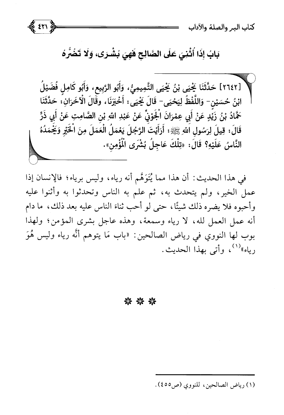 [٢٦٤٢] حَدَّثَنَا يَحْيَى بْنُ يَحْيَى التَّمِيمِيُّ، وَأَبُو الرَّبِيعِ، وَأَبُو كَامِلٍ فُضَيْلُ بْنُ حُسَيْنٍ- وَاللَّفْظُ لِيَحْيَى- قَالَ يَحْيَى: أَخْبَرَنَا، وقَالَ الْآخَرَانِ: حَدَّثَنَا حَمَّادُ بْنُ زَيْدٍ عَنْ أَبِي عِمْرَانَ الْجَوْنِيِّ عَنْ عَبْدِ اللَّهِ بْنِ الصَّامِتِ عَنْ أَبِي ذَرٍّ قَالَ: قِيلَ لِرَسُولِ اللَّهِ صلى الله عليه وسلم: أَرَأَيْتَ الرَّجُلَ يَعْمَلُ الْعَمَلَ مِنَ الْخَيْرِ وَيَحْمَدُهُ النَّاسُ عَلَيْهِ؟ قَالَ: ((تِلْكَ عَاجِلُ بُشْرَى الْمُؤْمِنِ)).
