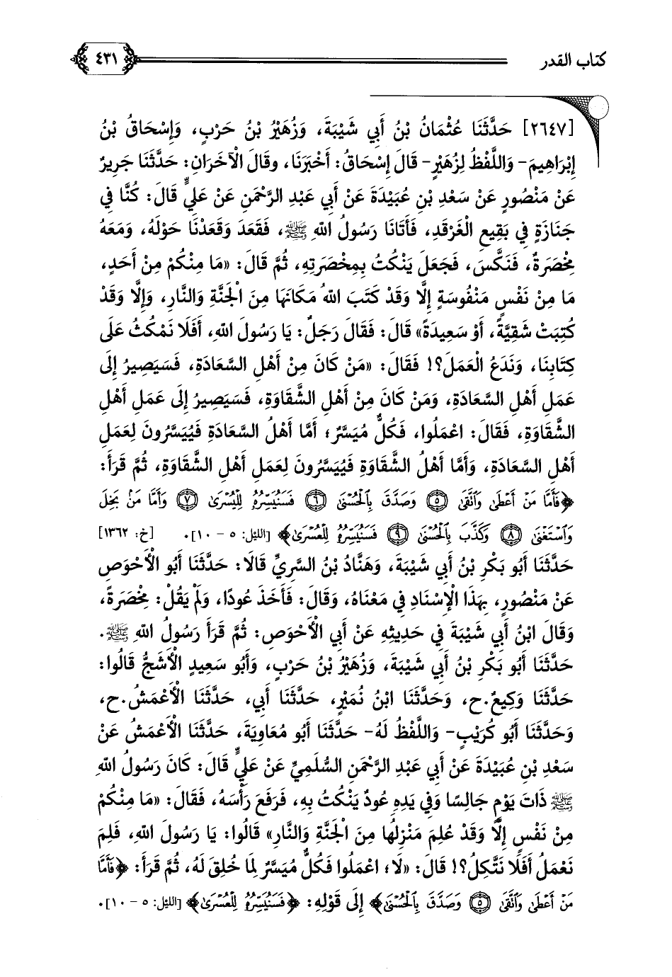 حَدَّثَنَا أَبُو بَكْرِ بْنُ أَبِي شَيْبَةَ، وَزُهَيْرُ بْنُ حَرْبٍ، وَأَبُو سَعِيدٍ الْأَشَجُّ قَالُوا: حَدَّثَنَا وَكِيعٌ. ح، وَحَدَّثَنَا ابْنُ نُمَيْرٍ، حَدَّثَنَا أَبِي، حَدَّثَنَا الْأَعْمَشُ. ح، وَحَدَّثَنَا أَبُو كُرَيْبٍ- وَاللَّفْظُ لَهُ- حَدَّثَنَا أَبُو مُعَاوِيَةَ، حَدَّثَنَا الْأَعْمَشُ عَنْ سَعْدِ بْنِ عُبَيْدَةَ عَنْ أَبِي عَبْدِ الرَّحْمَنِ السُّلَمِيِّ عَنْ عَلِيٍّ قَالَ: كَانَ رَسُولُ اللَّهِ صلى الله عليه وسلم ذَاتَ يَوْمٍ جَالِسًا وَفِي يَدِهِ عُودٌ يَنْكُتُ بِهِ، فَرَفَعَ رَأْسَهُ، فَقَالَ: ((مَا مِنْكُمْ مِنْ نَفْسٍ إِلَّا وَقَدْ عُلِمَ مَنْزِلُهَا مِنَ الْجَنَّةِ وَالنَّارِ)) قَالُوا: يَا رَسُولَ اللَّهِ، فَلِمَ نَعْمَلُ أَفَلَا نَتَّكِلُ؟ ! قَالَ: ((لَا؛ اعْمَلُوا فَكُلٌّ مُيَسَّرٌ لِمَا خُلِقَ لَهُ، ثُمَّ قَرَأَ: {فَأَمَّا مَنْ أَعْطَى وَاتَّقَى وَصَدَّقَ بِالْحُسْنَى} إِلَى قَوْلِهِ: {فَسَنُيَسِّرُهُ لِلْعُسْرَى}.