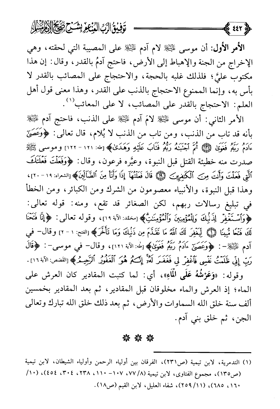 الأمر الأول: أن موسى عليه السلام لام آدم عليه السلام على المصيبة التي لحقته، وهي الإخراج من الجنة والإهباط إلى الأرض، فاحتج آدمُ بالقدر، وقال: إن هذا مكتوب عليَّ؛ فلذلك غلبه بالحجة، والاحتجاج على المصائب بالقدر لا بأس به، وإنما الممنوع الاحتجاج بالذنب على القدر، وهذا معنى قول أهل العلم: الاحتجاج بالقدر على المصائب، لا على المعائب (¬١).