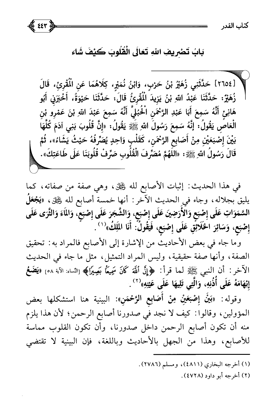 [٢٦٥٤] حَدَّثَنِي زُهَيْرُ بْنُ حَرْبٍ، وَابْنُ نُمَيْرٍ، كِلَاهُمَا عَنِ الْمُقْرِئِ، قَالَ زُهَيْرٌ: حَدَّثَنَا عَبْدُ اللَّهِ بْنُ يَزِيدَ الْمُقْرِئُ قَالَ: حَدَّثَنَا حَيْوَةُ، أَخْبَرَنِي أَبُو هَانِئٍ أَنَّهُ سَمِعَ أَبَا عَبْدِ الرَّحْمَنِ الْحُبُلِيَّ أَنَّهُ سَمِعَ عَبْدَ اللَّهِ بْنَ عَمْرِو بْنِ الْعَاصِ يَقُولُ: إنَّهُ سَمِعَ رَسُولَ اللَّهِ صلى الله عليه وسلم يَقُولُ: ((إِنَّ قُلُوبَ بَنِي آدَمَ كُلَّهَا بَيْنَ إِصْبَعَيْنِ مِنْ أَصَابِعِ الرَّحْمَنِ، كَقَلْبٍ وَاحِدٍ يُصَرِّفُهُ حَيْثُ يَشَاءُ))، ثُمَّ قَالَ رَسُولُ اللَّهِ صلى الله عليه وسلم: ((اللَّهُمَّ مُصَرِّفَ الْقُلُوبِ صَرِّفْ قُلُوبَنَا عَلَى طَاعَتِكَ)).