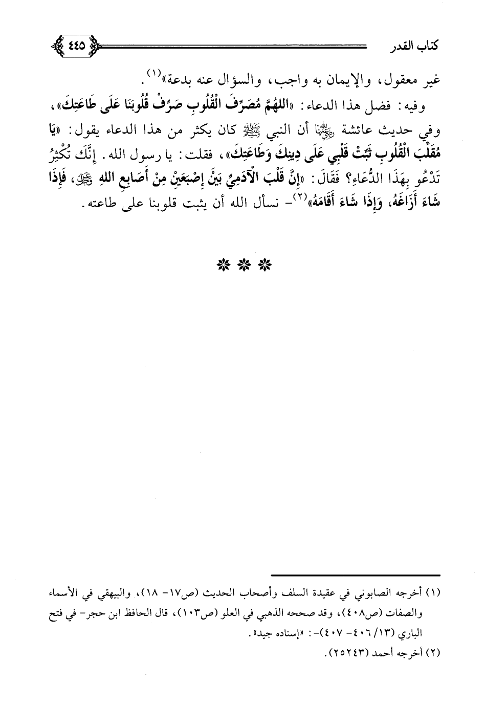 وفيه: فضل هذا الدعاء: ((اللَّهُمَّ مُصَرِّفَ الْقُلُوبِ صَرِّفْ قُلُوبَنَا عَلَى طَاعَتِكَ))، وفي حديث عائشة رضي الله عنها أن النبي صلى الله عليه وسلم كان يكثر من هذا الدعاء يقول: ((يا مقلب القلوب ثبت قلبي على دينك وطاعتك))، فقلت: يا رسول الله. إِنَّكَ تُكْثِرُ تَدْعُو بِهَذَا الدُّعَاءِ؟ فَقَالَ: ((إِنَّ قَلْبَ الْآدَمِيِّ بَيْنَ إِصْبَعَيْنِ مِنْ أَصَابِعِ اللهِ عَزَّ وَجَلَّ، فَإِذَا شَاءَ أَزَاغَهُ، وَإِذَا شَاءَ أَقَامَهُ)) (¬٢) - نسأل الله أن يثبت قلوبنا على طاعته.