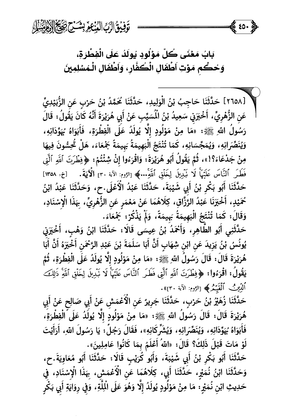 حَدَّثَنِي أَبُو الطَّاهِرِ، وَأَحْمَدُ بْنُ عِيسَى قَالَا: حَدَّثَنَا ابْنُ وَهْبٍ، أَخْبَرَنِي يُونُسُ بْنُ يَزِيدَ عَنِ ابْنِ شِهَابٍ أَنَّ أَبَا سَلَمَةَ بْنَ عَبْدِ الرَّحْمَنِ أَخْبَرَهُ أَنَّ أَبَا هُرَيْرَةَ قَالَ: قَالَ رَسُولُ اللَّهِ صلى الله عليه وسلم: ((مَا مِنْ مَوْلُودٍ إِلَّا يُولَدُ عَلَى الْفِطْرَةِ، ثُمَّ يَقُولُ: اقْرَءُوا: {فِطْرَةَ اللَّهِ الَّتِي فَطَرَ النَّاسَ عَلَيْهَا لا تَبْدِيلَ لِخَلْقِ اللَّهِ ذَلِكَ الدِّينُ الْقَيِّمُ})).