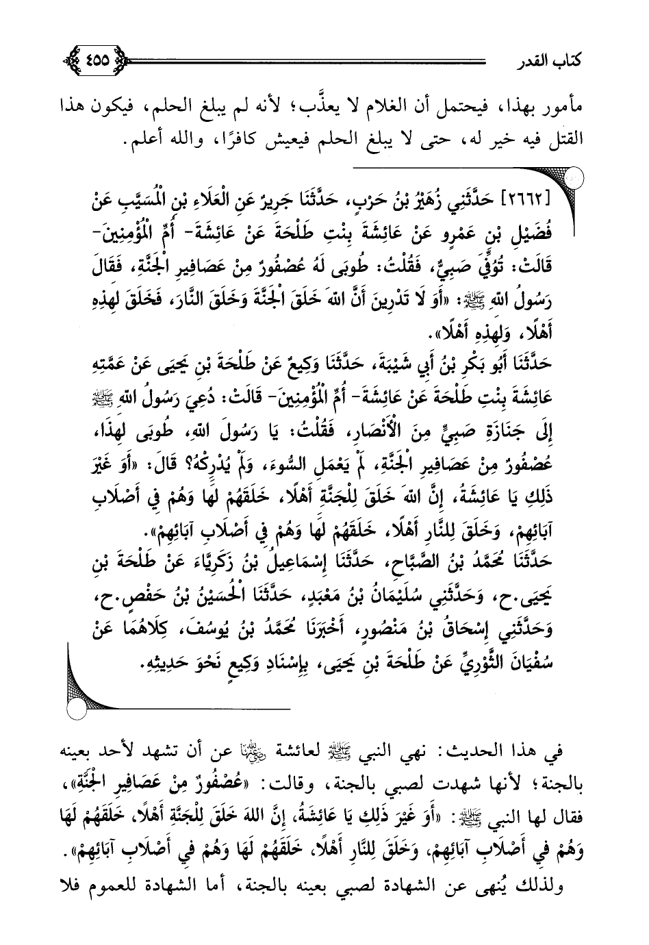 [٢٦٦٢] حَدَّثَنِي زُهَيْرُ بْنُ حَرْبٍ، حَدَّثَنَا جَرِيرٌ عَنِ الْعَلَاءِ بْنِ الْمُسَيَّبِ عَنْ فُضَيْلِ بْنِ عَمْرٍو عَنْ عَائِشَةَ بِنْتِ طَلْحَةَ عَنْ عَائِشَةَ- أُمِّ الْمُؤْمِنِينَ- قَالَتْ: تُوُفِّيَ صَبِيٌّ، فَقُلْتُ: طُوبَى لَهُ عُصْفُورٌ مِنْ عَصَافِيرِ الْجَنَّةِ، فَقَالَ رَسُولُ اللَّهِ صلى الله عليه وسلم: ((أَوَ لَا تَدْرِينَ أَنَّ اللَّهَ خَلَقَ الْجَنَّةَ وَخَلَقَ النَّارَ، فَخَلَقَ لِهَذِهِ أَهْلًا، وَلِهَذِهِ أَهْلًا)).