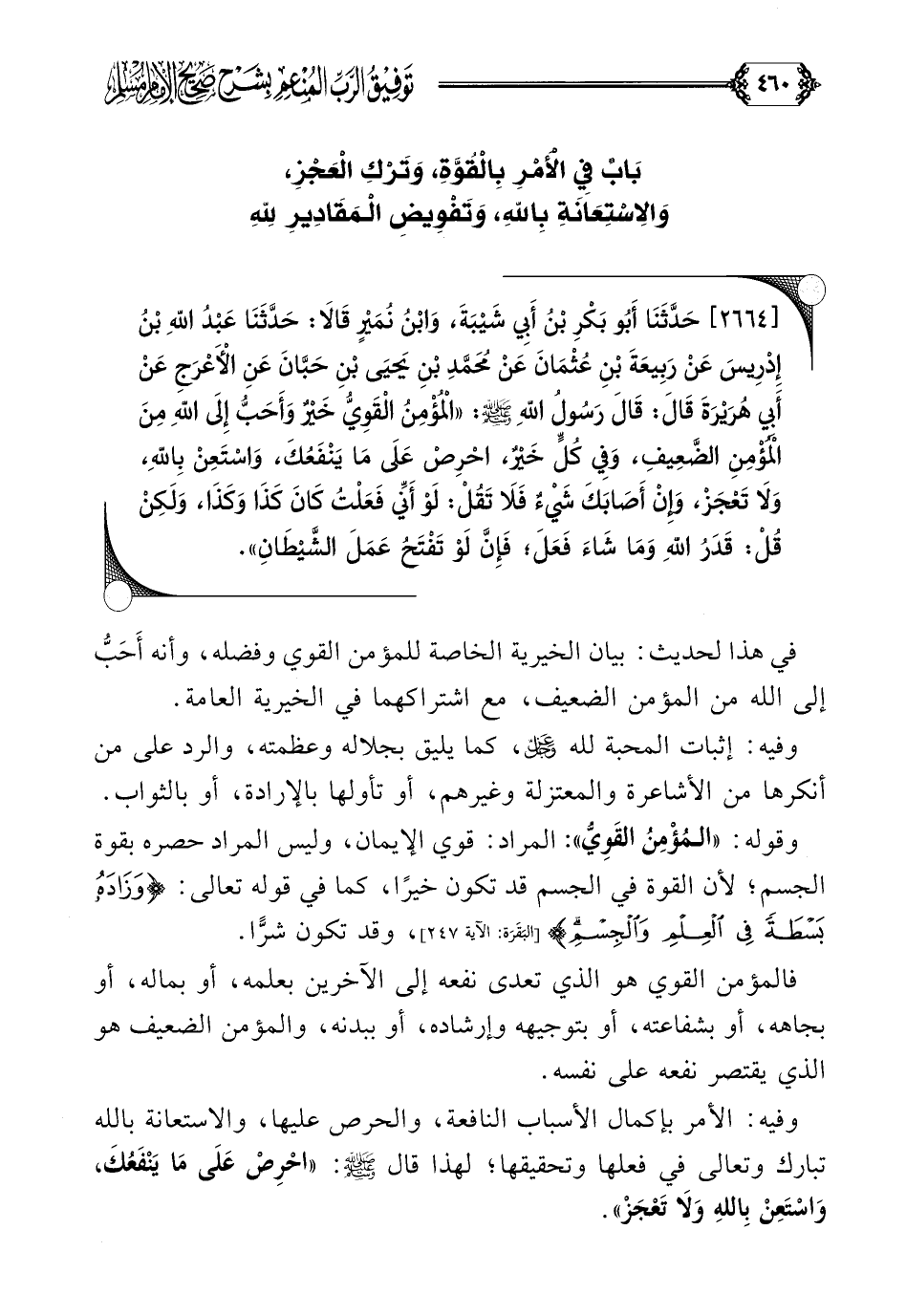 [٢٦٦٤] حَدَّثَنَا أَبُو بَكْرِ بْنُ أَبِي شَيْبَةَ، وَابْنُ نُمَيْرٍ قَالَا: حَدَّثَنَا عَبْدُ اللَّهِ بْنُ إِدْرِيسَ عَنْ رَبِيعَةَ بْنِ عُثْمَانَ عَنْ مُحَمَّدِ بْنِ يَحيَى بْنِ حَبَّانَ عَنِ الْأَعْرَجِ عَنْ أَبِي هُرَيْرَةَ قَالَ: قَالَ رَسُولُ اللَّهِ صلى الله عليه وسلم: ((الْمُؤْمِنُ الْقَوِيُّ خَيْرٌ وَأَحَبُّ إِلَى اللَّهِ مِنَ الْمُؤْمِنِ الضَّعِيفِ، وَفِي كُلٍّ خَيْرٌ، احْرِصْ عَلَى مَا يَنْفَعُكَ، وَاسْتَعِنْ بِاللَّهِ، وَلَا تَعْجَزْ، وَإِنْ أَصَابَكَ شَيْءٌ فَلَا تَقُلْ: لَوْ أَنِّي فَعَلْتُ كَانَ كَذَا وَكَذَا، وَلَكِنْ قُلْ: قَدَرُ اللَّهِ وَمَا شَاءَ فَعَلَ؛ فَإِنَّ لَوْ تَفْتَحُ عَمَلَ الشَّيْطَانِ)).