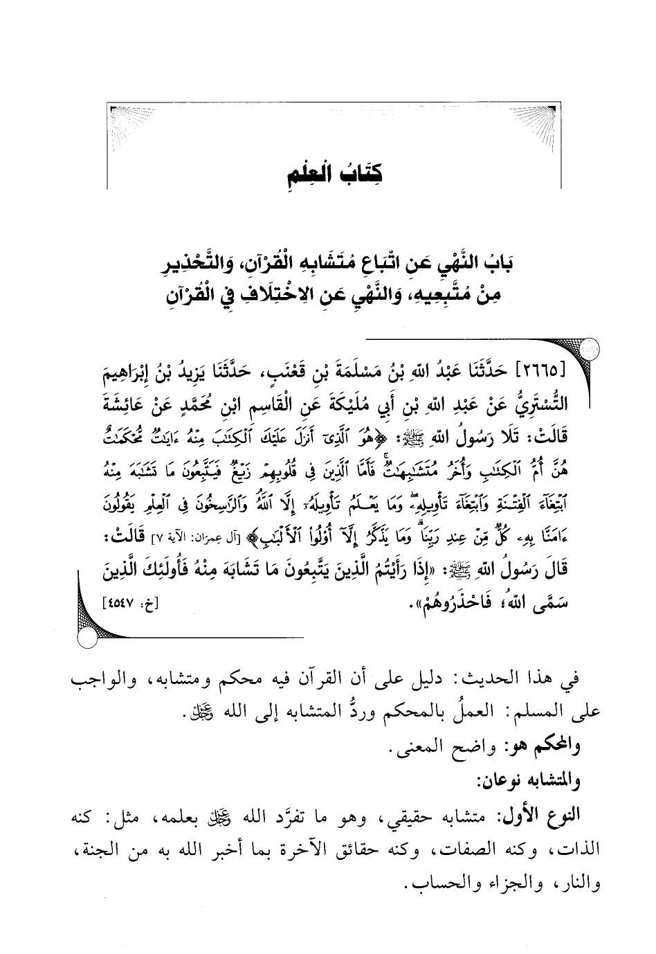 [٢٦٦٥] حَدَّثَنَا عَبْدُ اللَّهِ بْنُ مَسْلَمَةَ بْنِ قَعْنَبٍ، حَدَّثَنَا يَزِيدُ بْنُ إِبْرَاهِيمَ التُّسْتَرِيُّ عَنْ عَبْدِ اللَّهِ بْنِ أَبِي مُلَيْكَةَ عَنِ الْقَاسِمِ ابْنِ مُحَمَّدٍ عَنْ عَائِشَةَ قَالَتْ: تَلَا رَسُولُ اللَّهِ صلى الله عليه وسلم: {هُوَ الَّذِي أَنْزَلَ عَلَيْكَ الْكِتَابَ مِنْهُ آيَاتٌ مُحْكَمَاتٌ هُنَّ أُمُّ الْكِتَابِ وَأُخَرُ مُتَشَابِهَاتٌ فَأَمَّا الَّذِينَ فِي قُلُوبِهِمْ زَيْغٌ فَيَتَّبِعُونَ مَا تَشَابَهَ مِنْهُ ابْتِغَاءَ الْفِتْنَةِ وَابْتِغَاءَ تَأْوِيلِهِ وَمَا يَعْلَمُ تَأْوِيلَهُ إِلا اللَّهُ وَالرَّاسِخُونَ فِي الْعِلْمِ يَقُولُونَ آمَنَّا بِهِ كُلٌّ مِنْ عِنْدِ رَبِّنَا وَمَا يَذَّكَّرُ إِلا أُولُو الأَلْبَابِ} قَالَتْ: قَالَ رَسُولُ اللَّهِ صلى الله عليه وسلم: ((إِذَا رَأَيْتُمُ الَّذِينَ يَتَّبِعُونَ مَا تَشَابَهَ مِنْهُ فَأُولَئِكَ الَّذِينَ سَمَّى اللَّهُ؛ فَاحْذَرُوهُمْ)).