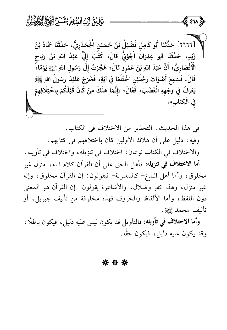 [٢٦٦٦] حَدَّثَنَا أَبُو كَامِلٍ فُضَيْلُ بْنُ حُسَيْنٍ الْجَحْدَرِيُّ، حَدَّثَنَا حَمَّادُ بْنُ زَيْدٍ، حَدَّثَنَا أَبُو عِمْرَانَ الْجَوْنِيُّ قَالَ: كَتَبَ إِلَيَّ عَبْدُ اللَّهِ بْنُ رَبَاحٍ الْأَنْصَارِيُّ: أَنَّ عَبْدَ اللَّهِ بْنَ عَمْرٍو قَالَ: هَجَّرْتُ إِلَى رَسُولِ اللَّهِ صلى الله عليه وسلم يَوْمًا، قَالَ: فَسَمِعَ أَصْوَاتَ رَجُلَيْنِ اخْتَلَفَا فِي آيَةٍ، فَخَرَجَ عَلَيْنَا رَسُولُ اللَّهِ صلى الله عليه وسلم يُعْرَفُ فِي وَجْهِهِ الْغَضَبُ، فَقَالَ: ((إِنَّمَا هَلَكَ مَنْ كَانَ قَبْلَكُمْ بِاخْتِلَافِهِمْ فِي الْكِتَابِ)).