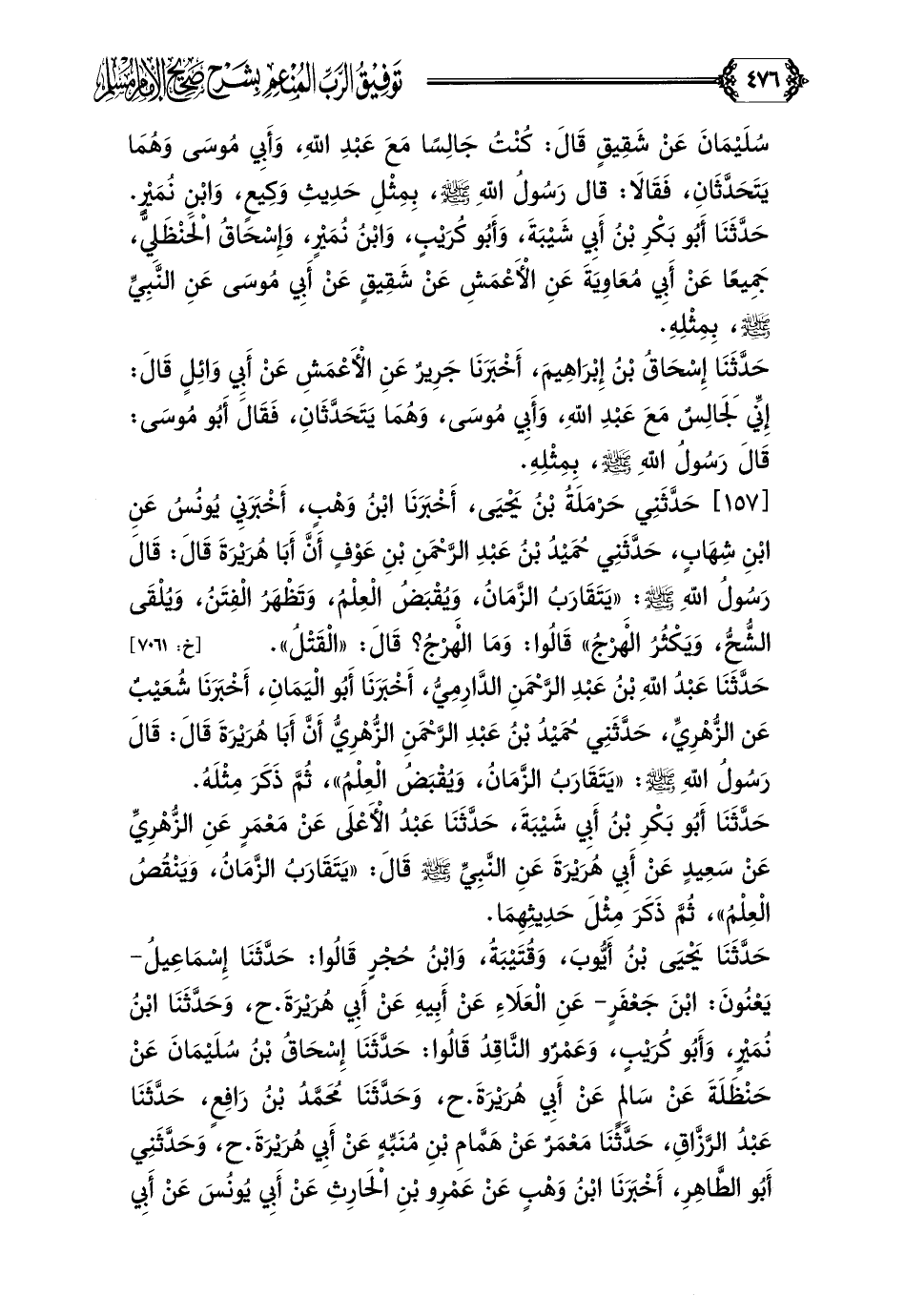 [١٥٧] حَدَّثَنِي حَرْمَلَةُ بْنُ يَحْيَى، أَخْبَرَنَا ابْنُ وَهْبٍ، أَخْبَرَنِي يُونُسُ عَنِ ابْنِ شِهَابٍ، حَدَّثَنِي حُمَيْدُ بْنُ عَبْدِ الرَّحْمَنِ بْنِ عَوْفٍ أَنَّ أَبَا هُرَيْرَةَ قَالَ: قَالَ رَسُولُ اللَّهِ صلى الله عليه وسلم: ((يَتَقَارَبُ الزَّمَانُ، وَيُقْبَضُ الْعِلْمُ، وَتَظْهَرُ الْفِتَنُ، وَيُلْقَى الشُّحُّ، وَيَكْثُرُ الْهَرْجُ)) قَالُوا: وَمَا الْهَرْجُ؟ قَالَ: ((الْقَتْلُ)).