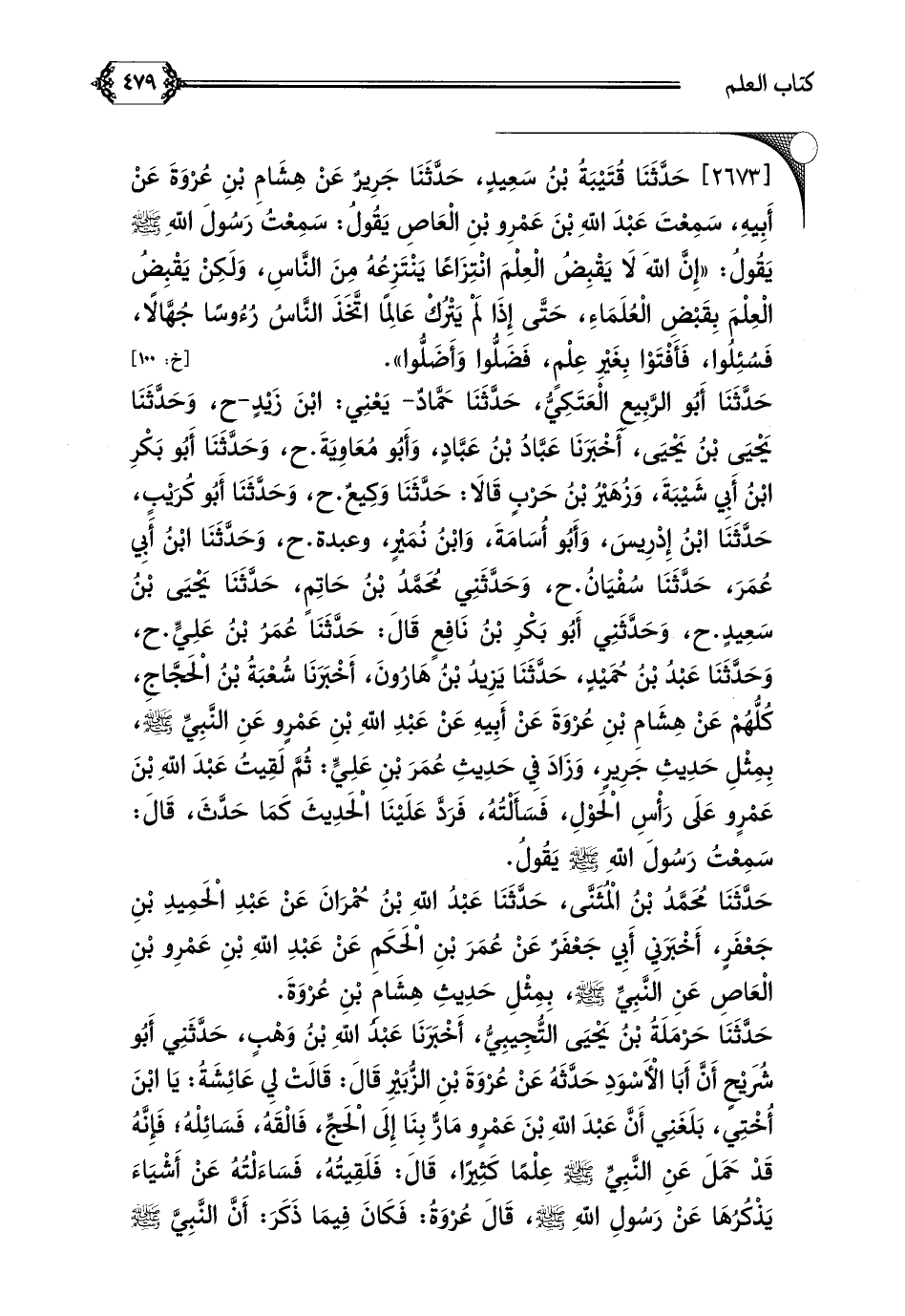 [٢٦٧٣] حَدَّثَنَا قُتَيْبَةُ بْنُ سَعِيدٍ، حَدَّثَنَا جَرِيرٌ عَنْ هِشَامِ بْنِ عُرْوَةَ عَنْ أَبِيهِ، سَمِعْتَ عَبْدَ اللَّهِ بْنَ عَمْرِو بْنِ الْعَاصِ يَقُولُ: سَمِعْتُ رَسُولَ اللَّهِ صلى الله عليه وسلم يَقُولُ: ((إِنَّ اللَّهَ لَا يَقْبِضُ الْعِلْمَ انْتِزَاعًا يَنْتَزِعُهُ مِنَ النَّاسِ، وَلَكِنْ يَقْبِضُ الْعِلْمَ بِقَبْضِ الْعُلَمَاءِ، حَتَّى إِذَا لَمْ يَتْرُكْ عَالِمًا اتَّخَذَ النَّاسُ رُءُوسًا جُهَّالًا، فَسُئِلُوا، فَأَفْتَوْا بِغَيْرِ عِلْمٍ، فَضَلُّوا وَأَضَلُّوا)).