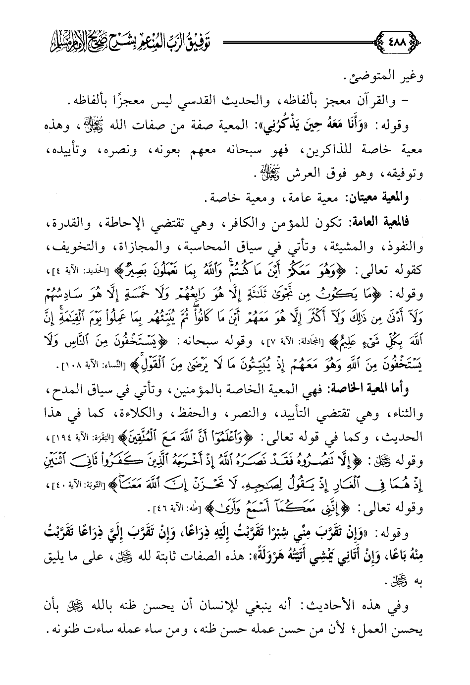 وأما المعية الخاصة: فهي المعية الخاصة بالمؤمنين، وتأتي في سياق المدح، والثناء، وهي تقتضي التأييد، والنصر، والحفظ، والكلاءة، كما في هذا الحديث، وكما في قوله تعالى: {وَاعْلَمُوا أَنَّ اللَّهَ مَعَ الْمُتَّقِينَ}، وقوله عز وجل: {إِلَّا تَنْصُرُوهُ فَقَدْ نَصَرَهُ اللَّهُ إِذْ أَخْرَجَهُ الَّذِينَ كَفَرُوا ثَانِيَ اثْنَيْنِ إِذْ هُمَا فِي الْغَارِ إِذْ يَقُولُ لِصَاحِبِهِ لَا تَحْزَنْ إِنَّ اللَّهَ مَعَنَا}، وقوله تعالى: {إنني معكما أسمع وأرى}.