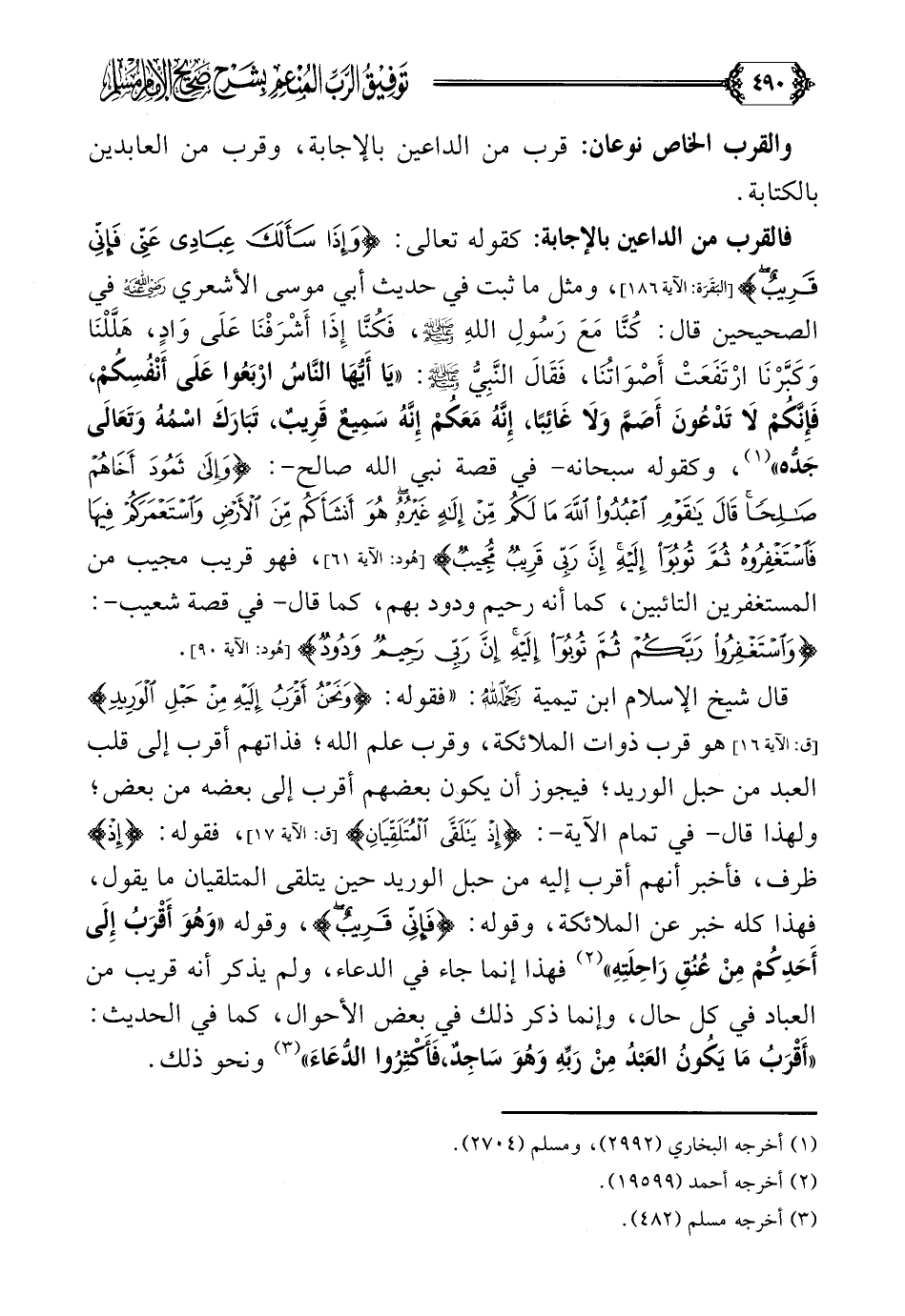 فالقرب من الداعين بالإجابة: كقوله تعالى: {وإذا سألك عبادي عني فإني قريب}، ومثل ما ثبت في حديث أبي موسى الأشعري رضي الله عنه في الصحيحين، قال: ((كُنَّا مَعَ رَسُولِ اللَّهِ صَلَّى اللهُ عَلَيْهِ وَسَلَّمَ، فَكُنَّا إِذَا أَشْرَفْنَا عَلَى وَادٍ، هَلَّلْنَا وَكَبَّرْنَا ارْتَفَعَتْ أَصْوَاتُنَا، فَقَالَ النَّبِيُّ صَلَّى اللهُ عَلَيْهِ وَسَلَّمَ: «يَا أَيُّهَا النَّاسُ ارْبَعُوا عَلَى أَنْفُسِكُمْ، فَإِنَّكُمْ لا تَدْعُونَ أَصَمَّ وَلا غَائِبًا، إِنَّهُ مَعَكُمْ إِنَّهُ سَمِيعٌ قَرِيبٌ، تَبَارَكَ اسْمُهُ وَتَعَالَى جَدُّه)) (¬١)، وكقوله سبحانه- في قصة نبي الله صالح-: {وإلى ثمود أخاهم صالحًا قال يا قوم اعبدوا الله ما لكم من إله غيره واستغفروا ربكم ثم توبوا إليه إن ربي قريب مجيب}، فهو قريب مجيب من المستغفرين التائبين، كما أنه رحيم ودود بهم، كما قال- في قصة شعيب-: {واستغفروا ربكم ثم توبوا إليه إن ربي رحيم ودود}.