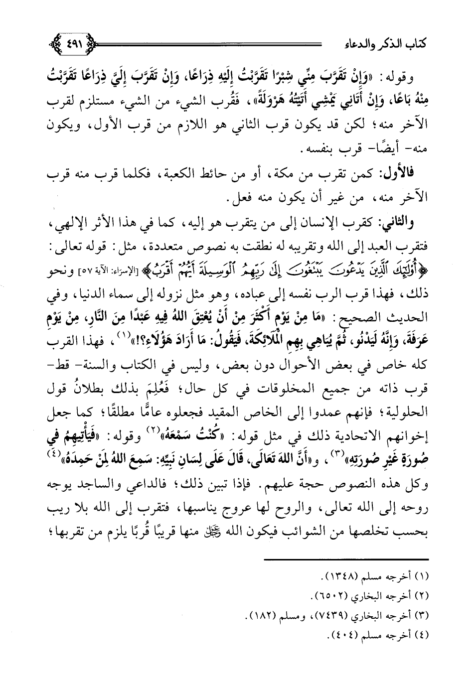 والثاني: كقرب الإنسان إلى من يتقرب هو إليه، كما في هذا الأثر الإلهي، فتقرب العبد إلى الله وتقريبه له نطقت به نصوص متعددة، مثل: قوله تعالى: {أولئك الذين يدعون يبتغون إلى ربهم الوسيلة أيهم أقرب} ونحو ذلك، فهذا قرب الرب نفسه إلى عباده، وهو مثل نزوله إلى سماء الدنيا، وفي الحديث الصحيح: ((مَا مِنْ يَوْمٍ أَكْثَرَ مِنْ أَنْ يُعْتِقَ اللهُ فِيهِ عَبْدًا مِنَ النَّارِ، مِنْ يَوْمِ عَرَفَةَ، وَإِنَّهُ لَيَدْنُو، ثُمَّ يُبَاهِي بِهِمِ الْمَلَائِكَةَ، فَيَقُولُ: مَا أَرَادَ هَؤُلَاءِ؟ ! )) (¬٢)، فهذا القرب كله خاص في بعض الأحوال دون بعض، وليس في الكتاب والسنة- قط- قرب ذاته من جميع المخلوقات في كل حال؛ فَعُلِمَ بذلك بطلانُ قول الحلولية؛ فإنهم عمدوا إلى الخاص المقيد فجعلوه عامًّا مطلقًا؛ كما جعل إخوانهم الاتحادية ذلك في مثل قوله: ((كُنْتُ سَمْعَهُ)) (¬٣) وقوله ((فيأتيهم في صورة غير صورته)) (¬٤)، و ((أن الله تعالى قال على لسان نبيه سمع الله لمن حمده)) (¬٥) وكل هذه النصوص حجة عليهم. فإذا تبين ذلك؛ فالداعي والساجد يوجه روحه إلى الله تعالى، والروح لها عروج يناسبها، فتقرب إلى الله بلا ريب بحسب تخلصها من الشوائب فيكون الله عز وجل منها قريبا قُربًا يلزم من تقربها؛