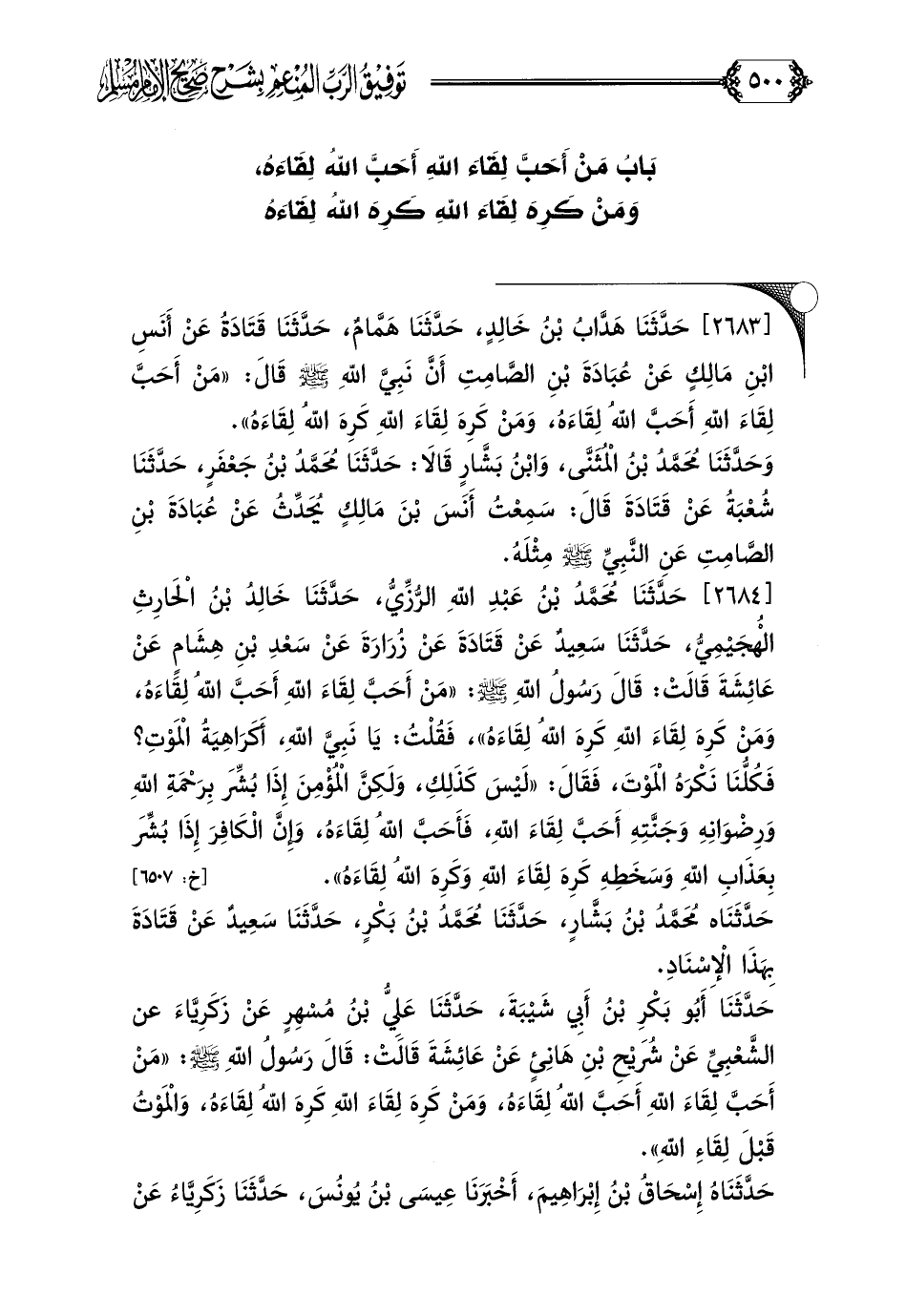 [٢٦٨٣] حَدَّثَنَا هَدَّابُ بْنُ خَالِدٍ، حَدَّثَنَا هَمَّامٌ، حَدَّثَنَا قَتَادَةُ عَنْ أَنَسِ بْنِ مَالِكٍ عَنْ عُبَادَةَ بْنِ الصَّامِتِ أَنَّ نَبِيَّ اللَّهِ صلى الله عليه وسلم قَالَ: ((مَنْ أَحَبَّ لِقَاءَ اللَّهِ أَحَبَّ اللَّهُ لِقَاءَهُ، وَمَنْ كَرِهَ لِقَاءَ اللَّهِ كَرِهَ اللَّهُ لِقَاءَهُ)).