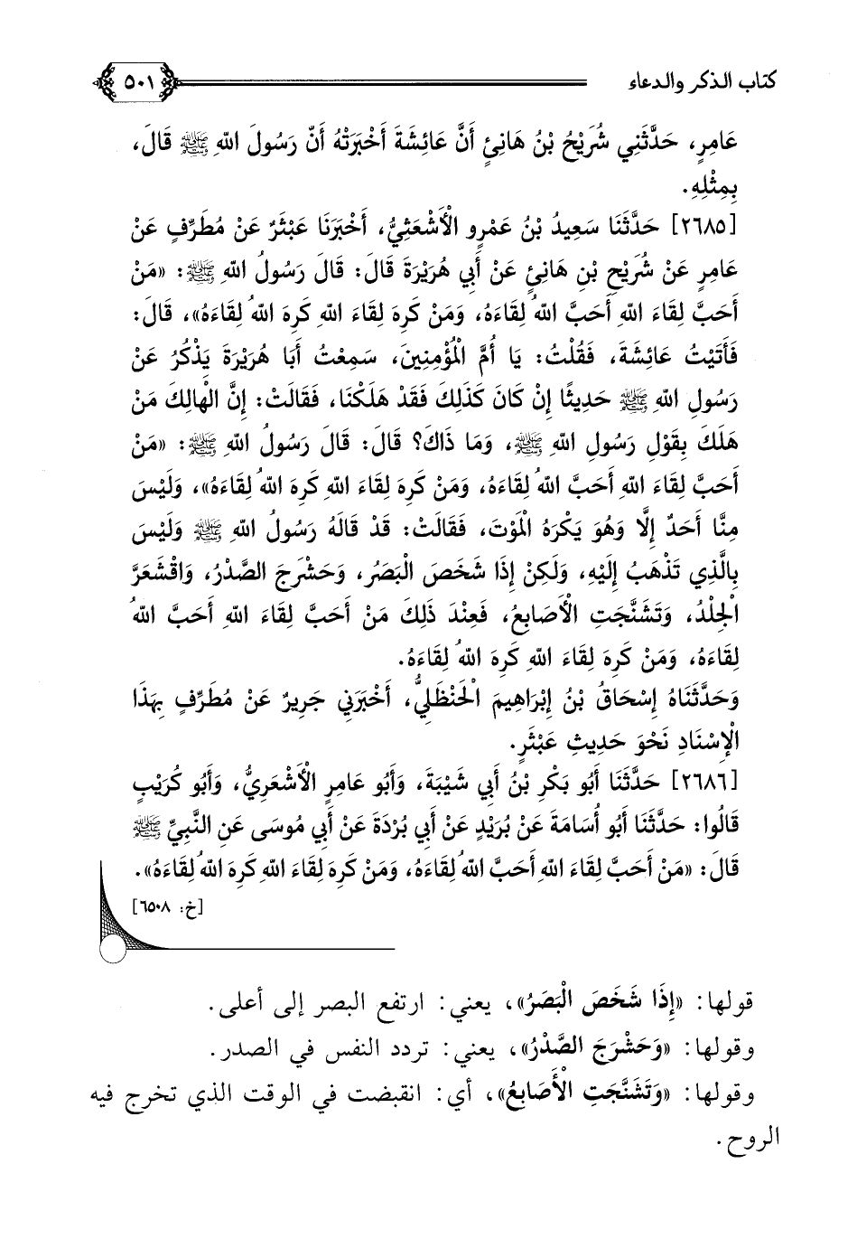 [٢٦٨٥] حَدَّثَنَا سَعِيدُ بْنُ عَمْرٍو الْأَشْعَثِيُّ، أَخْبَرَنَا عَبْثَرٌ عَنْ مُطَرِّفٍ عَنْ عَامِرٍ عَنْ شُرَيْحِ بْنِ هَانِئٍ عَنْ أَبِي هُرَيْرَةَ قَالَ: قَالَ رَسُولُ اللَّهِ صلى الله عليه وسلم: ((مَنْ أَحَبَّ لِقَاءَ اللَّهِ أَحَبَّ اللَّهُ لِقَاءَهُ، وَمَنْ كَرِهَ لِقَاءَ اللَّهِ كَرِهَ اللَّهُ لِقَاءَهُ))، قَالَ: فَأَتَيْتُ عَائِشَةَ، فَقُلْتُ: يَا أُمَّ الْمُؤْمِنِينَ، سَمِعْتُ أَبَا هُرَيْرَةَ يَذْكُرُ عَنْ رَسُولِ اللَّهِ صلى الله عليه وسلم حَدِيثًا إِنْ كَانَ كَذَلِكَ فَقَدْ هَلَكْنَا، فَقَالَتْ: إِنَّ الْهَالِكَ مَنْ هَلَكَ بِقَوْلِ رَسُولِ اللَّهِ صلى الله عليه وسلم، وَمَا ذَاكَ؟ قَالَ: قَالَ رَسُولُ اللَّهِ صلى الله عليه وسلم: ((مَنْ أَحَبَّ لِقَاءَ اللَّهِ أَحَبَّ اللَّهُ لِقَاءَهُ، وَمَنْ كَرِهَ لِقَاءَ اللَّهِ كَرِهَ اللَّهُ لِقَاءَهُ))، وَلَيْسَ مِنَّا أَحَدٌ إِلَّا وَهُوَ يَكْرَهُ الْمَوْتَ، فَقَالَتْ: قَدْ قَالَهُ رَسُولُ اللَّهِ صلى الله عليه وسلم وَلَيْسَ بِالَّذِي تَذْهَبُ إِلَيْهِ، وَلَكِنْ إِذَا شَخَصَ الْبَصَرُ، وَحَشْرَجَ الصَّدْرُ، وَاقْشَعَرَّ الْجِلْدُ، وَتَشَنَّجَتِ الْأَصَابِعُ، فَعِنْدَ ذَلِكَ مَنْ أَحَبَّ لِقَاءَ اللَّهِ أَحَبَّ اللَّهُ لِقَاءَهُ، وَمَنْ كَرِهَ لِقَاءَ اللَّهِ كَرِهَ اللَّهُ لِقَاءَهُ.
