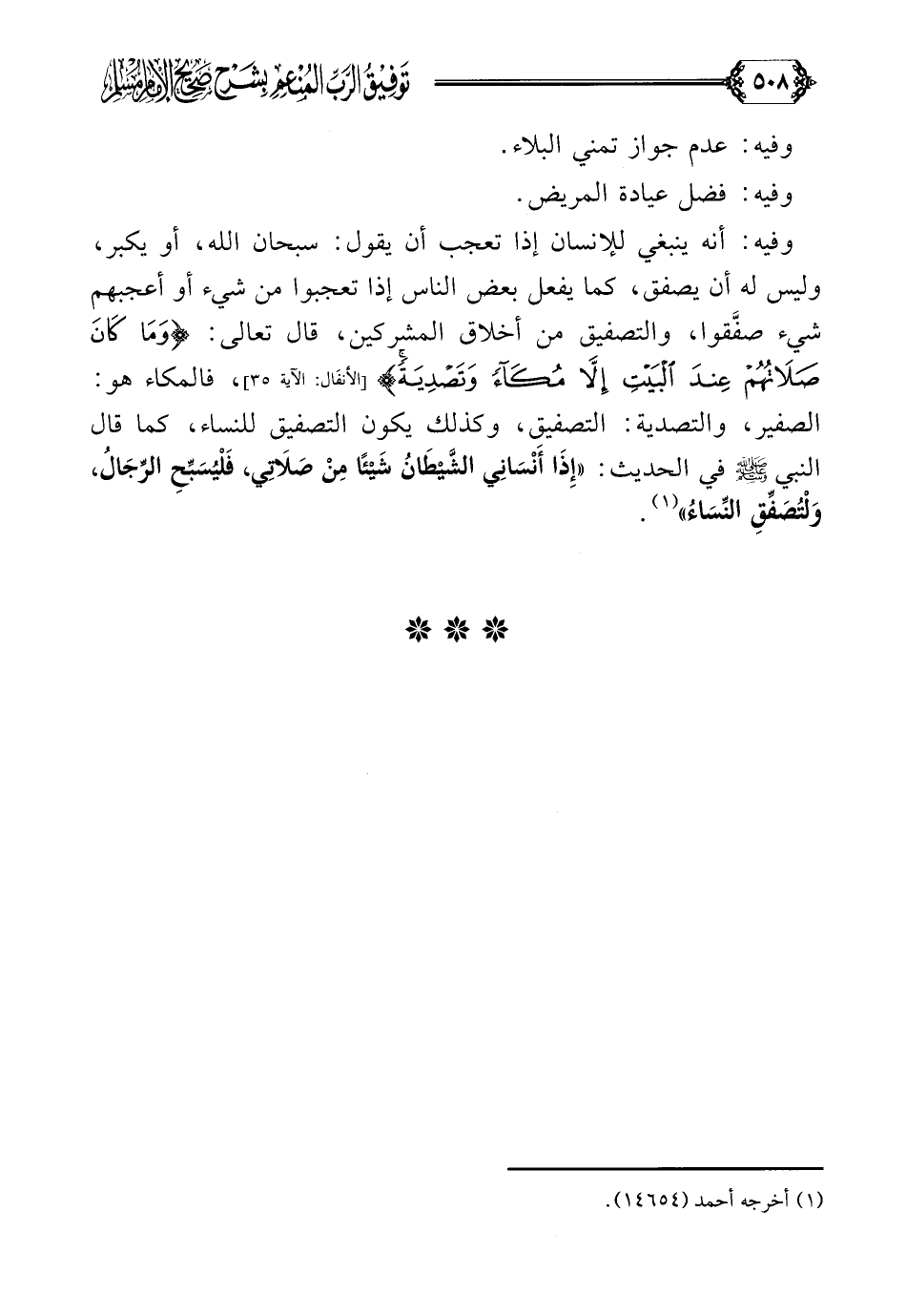 وفيه: أنه ينبغي للإنسان إذا تعجب أن يقول: سبحان الله، أو يكبر، وليس له أن يصفق، كما يفعل بعض الناس إذا تعجبوا من شيء أو أعجبهم شيء صفَّقوا، والتصفيق من أخلاق المشركين، قال تعالى: {وما كان صلاتهم عند البيت إلا مكاء وتصدية}، فالمكاء هو: الصفير، والتصدية: التصفيق، وكذلك يكون التصفيق للنساء، كما قال النبي صلى الله عليه وسلم في الحديث: ((إِذَا أَنْسَانِي الشَّيْطَانُ شَيْئًا مِنْ صَلَاتِي، فَلْيُسَبِّحِ الرِّجَالُ، وَلْتُصَفِّقِ النِّسَاءُ)) (¬١).