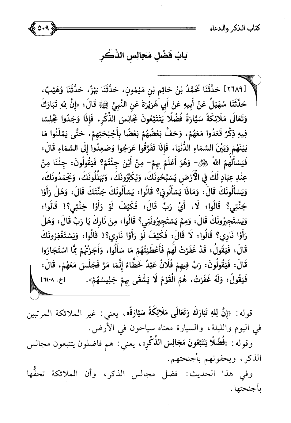[٢٦٨٩] حَدَّثَنَا مُحَمَّدُ بْنُ حَاتِمِ بْنِ مَيْمُونٍ، حَدَّثَنَا بَهْزٌ، حَدَّثَنَا وُهَيْبٌ، حَدَّثَنَا سُهَيْلٌ عَنْ أَبِيهِ عَنْ أَبِي هُرَيْرَةَ عَنِ النَّبِيِّ صلى الله عليه وسلم قَالَ: ((إِنَّ لِلَّهِ تَبَارَكَ وَتَعَالَى مَلَائِكَةً سَيَّارَةً فُضُلًا يَتَتَبَّعُونَ مَجَالِسَ الذِّكْرِ، فَإِذَا وَجَدُوا مَجْلِسًا فِيهِ ذِكْرٌ قَعَدُوا مَعَهُمْ، وَحَفَّ بَعْضُهُمْ بَعْضًا بِأَجْنِحَتِهِمْ، حَتَّى يَمْلَئُوا مَا بَيْنَهُمْ وَبَيْنَ السَّمَاءِ الدُّنْيَا، فَإِذَا تَفَرَّقُوا عَرَجُوا وَصَعِدُوا إِلَى السَّمَاءِ قَالَ: فَيَسْأَلُهُمُ اللَّهُ عز وجل- وَهُوَ أَعْلَمُ بِهِمْ- مِنْ أَيْنَ جِئْتُمْ؟ فَيَقُولُونَ: جِئْنَا مِنْ عِنْدِ عِبَادٍ لَكَ فِي الْأَرْضِ يُسَبِّحُونَكَ، وَيُكَبِّرُونَكَ، وَيُهَلِّلُونَكَ، وَيَحْمَدُونَكَ، وَيَسْأَلُونَكَ قَالَ: وَمَاذَا يَسْأَلُونِي؟ قَالُوا: يَسْأَلُونَكَ جَنَّتَكَ قَالَ: وَهَلْ رَأَوْا جَنَّتِي؟ قَالُوا: لَا، أَيْ رَبِّ قَالَ: فَكَيْفَ لَوْ رَأَوْا جَنَّتِي؟ ! قَالُوا: وَيَسْتَجِيرُونَكَ قَالَ: وَمِمَّ يَسْتَجِيرُونَنِي؟ قَالُوا: مِنْ نَارِكَ يَا رَبِّ قَالَ: وَهَلْ رَأَوْا نَارِي؟ قَالُوا: لَا قَالَ: فَكَيْفَ لَوْ رَأَوْا نَارِي؟ ! قَالُوا: وَيَسْتَغْفِرُونَكَ قَالَ: فَيَقُولُ: قَدْ غَفَرْتُ لَهُمْ فَأَعْطَيْتُهُمْ مَا سَأَلُوا، وَأَجَرْتُهُمْ مِمَّا اسْتَجَارُوا قَالَ: فَيَقُولُونَ: رَبِّ فِيهِمْ فُلَانٌ عَبْدٌ خَطَّاءٌ إِنَّمَا مَرَّ فَجَلَسَ مَعَهُمْ قَالَ: فَيَقُولُ: وَلَهُ غَفَرْتُ، هُمُ الْقَوْمُ لَا يَشْقَى بِهِمْ جَلِيسُهُمْ)).