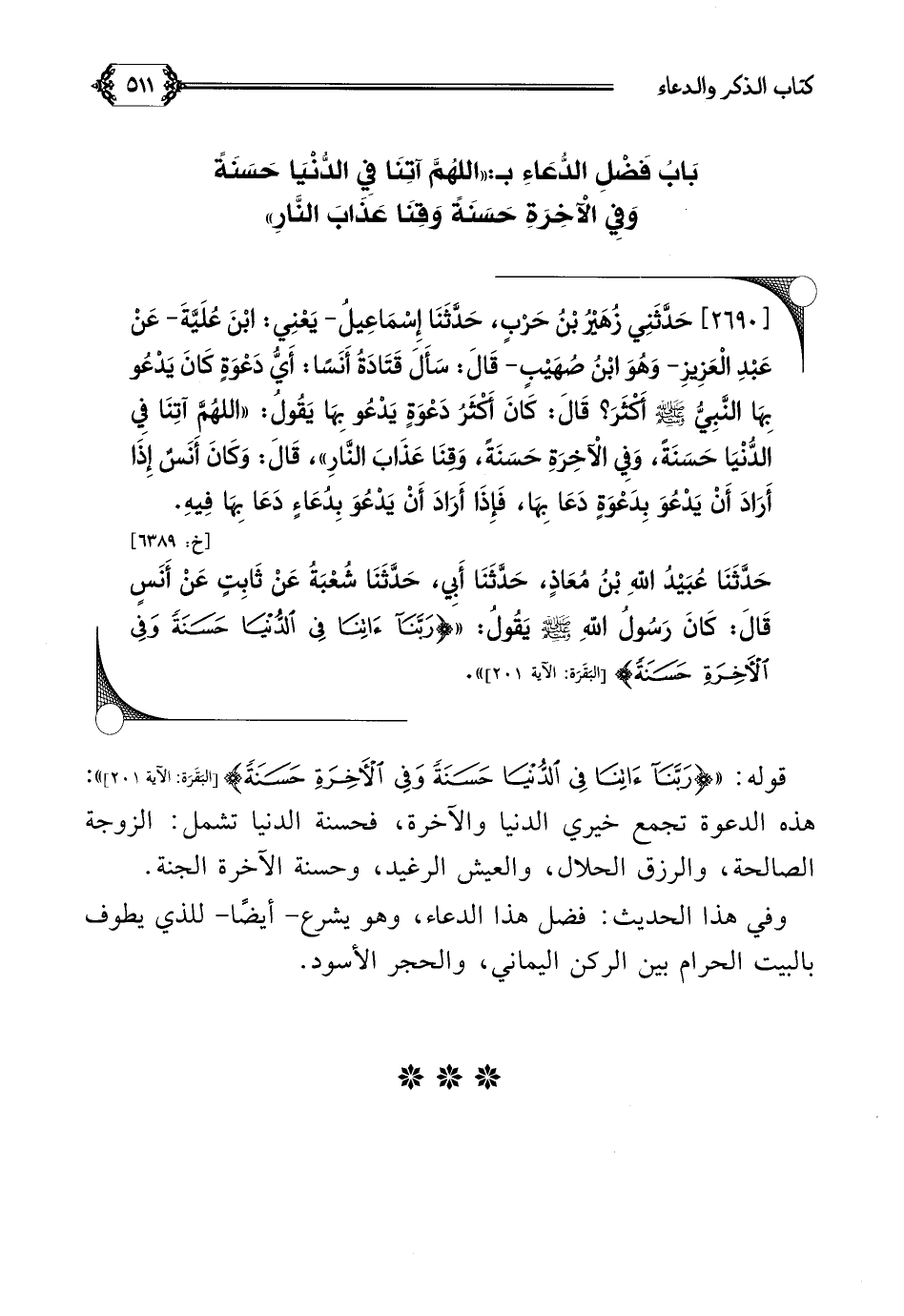 بَابُ فَضْلِ الدُّعَاءِ بـ: {اللَّهُمَّ آتِنَا فِي الدُّنْيَا حَسَنَةً وَفِي الْآخِرَةِ حَسَنَةً وَقِنَا عَذَابَ النَّارِ}