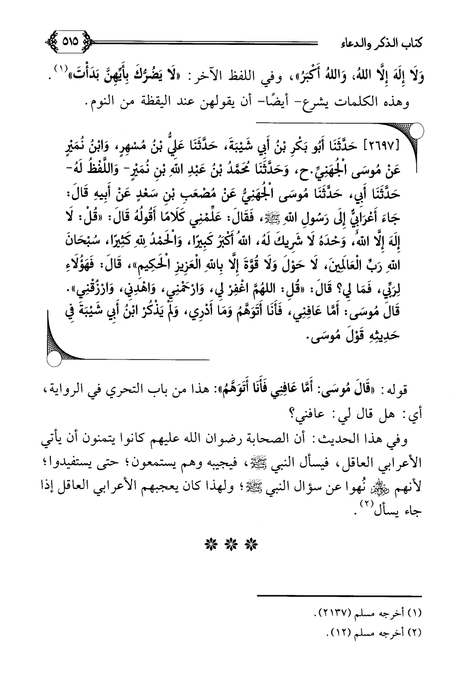 [٢٦٩٧] حَدَّثَنَا أَبُو بَكْرِ بْنُ أَبِي شَيْبَةَ، حَدَّثَنَا عَلِيُّ بْنُ مُسْهِرٍ، وَابْنُ نُمَيْرٍ عَنْ مُوسَى الْجُهَنِيِّ. ح، وَحَدَّثَنَا مُحَمَّدُ بْنُ عَبْدِ اللَّهِ بْنِ نُمَيْرٍ- وَاللَّفْظُ لَهُ- حَدَّثَنَا أَبِي، حَدَّثَنَا مُوسَى الْجُهَنِيُّ عَنْ مُصْعَبِ بْنِ سَعْدٍ عَنْ أَبِيهِ قَالَ: جَاءَ أَعْرَابِيٌّ إِلَى رَسُولِ اللَّهِ صلى الله عليه وسلم، فَقَالَ: عَلِّمْنِي كَلَامًا أَقُولُهُ قَالَ: ((قُلْ: لَا إِلَهَ إِلَّا اللَّهُ، وَحْدَهُ لَا شَرِيكَ لَهُ، اللَّهُ أَكْبَرُ كَبِيرًا، وَالْحَمْدُ لِلَّهِ كَثِيرًا، سُبْحَانَ اللَّهِ رَبِّ الْعَالَمِينَ، لَا حَوْلَ وَلَا قُوَّةَ إِلَّا بِاللَّهِ الْعَزِيزِ الْحَكِيمِ))، قَالَ: فَهَؤُلَاءِ لِرَبِّي، فَمَا لِي؟ قَالَ: ((قُلِ: اللَّهُمَّ اغْفِرْ لِي، وَارْحَمْنِي، وَاهْدِنِي، وَارْزُقْنِي)).