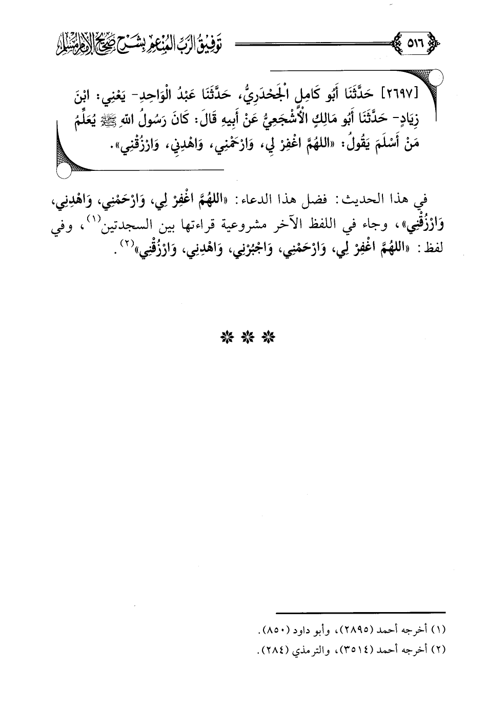 [٢٦٩٧] حَدَّثَنَا أَبُو كَامِلٍ الْجَحْدَرِيُّ، حَدَّثَنَا عَبْدُ الْوَاحِدِ- يَعْنِي: ابْنَ زِيَادٍ- حَدَّثَنَا أَبُو مَالِكٍ الْأَشْجَعِيُّ عَنْ أَبِيهِ قَالَ: كَانَ رَسُولُ اللَّهِ صلى الله عليه وسلم يُعَلِّمُ مَنْ أَسْلَمَ يَقُولُ: ((اللَّهُمَّ اغْفِرْ لِي، وَارْحَمْنِي، وَاهْدِنِي، وَارْزُقْنِي)).