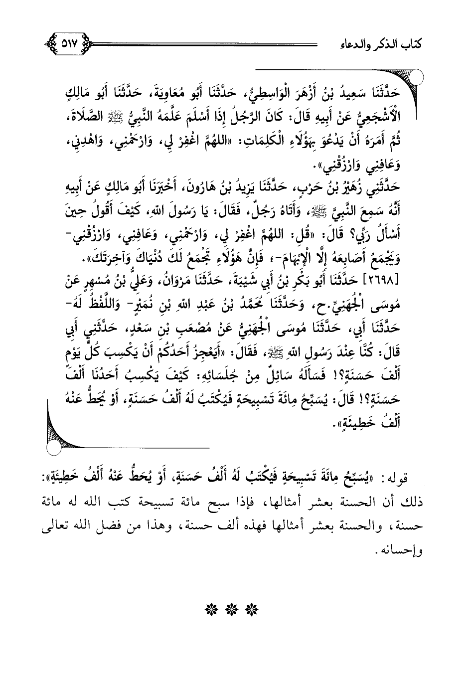 [٢٦٩٨] حَدَّثَنَا أَبُو بَكْرِ بْنُ أَبِي شَيْبَةَ، حَدَّثَنَا مَرْوَانُ، وَعَلِيُّ بْنُ مُسْهِرٍ عَنْ مُوسَى الْجُهَنِيِّ. ح، وَحَدَّثَنَا مُحَمَّدُ بْنُ عَبْدِ اللَّهِ بْنِ نُمَيْرٍ- وَاللَّفْظُ لَهُ- حَدَّثَنَا أَبِي، حَدَّثَنَا مُوسَى الْجُهَنِيُّ عَنْ مُصْعَبِ بْنِ سَعْدٍ، حَدَّثَنِي أَبِي قَالَ: كُنَّا عِنْدَ رَسُولِ اللَّهِ صلى الله عليه وسلم، فَقَالَ: ((أَيَعْجِزُ أَحَدُكُمْ أَنْ يَكْسِبَ كُلَّ يَوْمٍ أَلْفَ حَسَنَةٍ؟ ! فَسَأَلَهُ سَائِلٌ مِنْ جُلَسَائِهِ: كَيْفَ يَكْسِبُ أَحَدُنَا أَلْفَ حَسَنَةٍ؟ ! قَالَ: يُسَبِّحُ مِائَةَ تَسْبِيحَةٍ فَيُكْتَبُ لَهُ أَلْفُ حَسَنَةٍ، أَوْ يُحَطُّ عَنْهُ أَلْفُ خَطِيئَةٍ)).