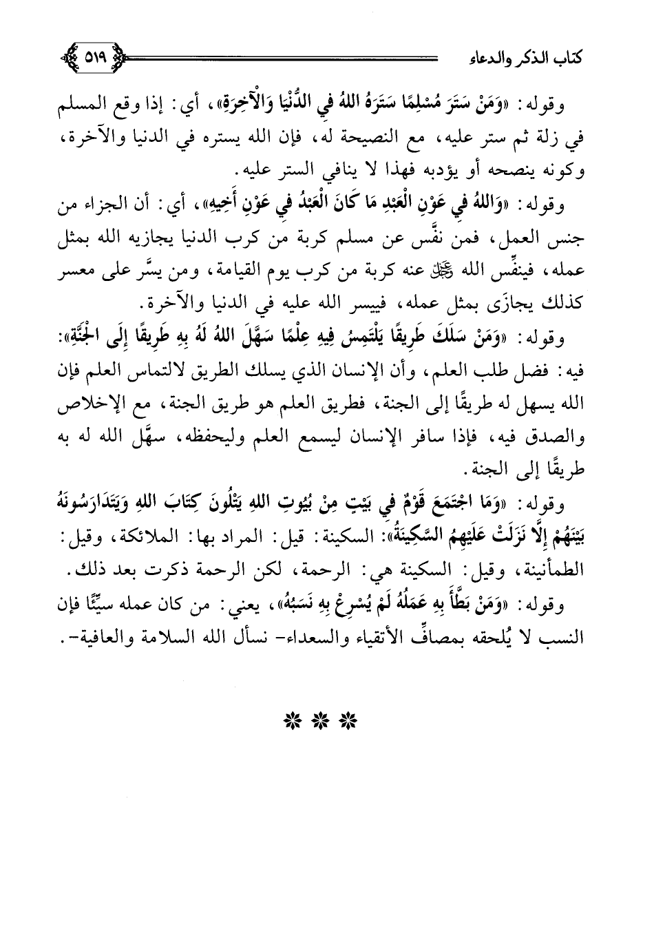 وقوله: ((وَمَا اجْتَمَعَ قَوْمٌ فِي بَيْتٍ مِنْ بُيُوتِ اللَّهِ يَتْلُونَ كِتَابَ اللَّهِ وَيَتَدَارَسُونَهُ بَيْنَهُمْ إِلَّا نَزَلَتْ عَلَيْهِمُ السَّكِينَةُ)): السكينة: قيل: المراد بها: الملائكة، وقيل: الطمأنينة، وقيل: السكينة هي: الرحمة، لكن الرحمة ذكرت بعد ذلك.