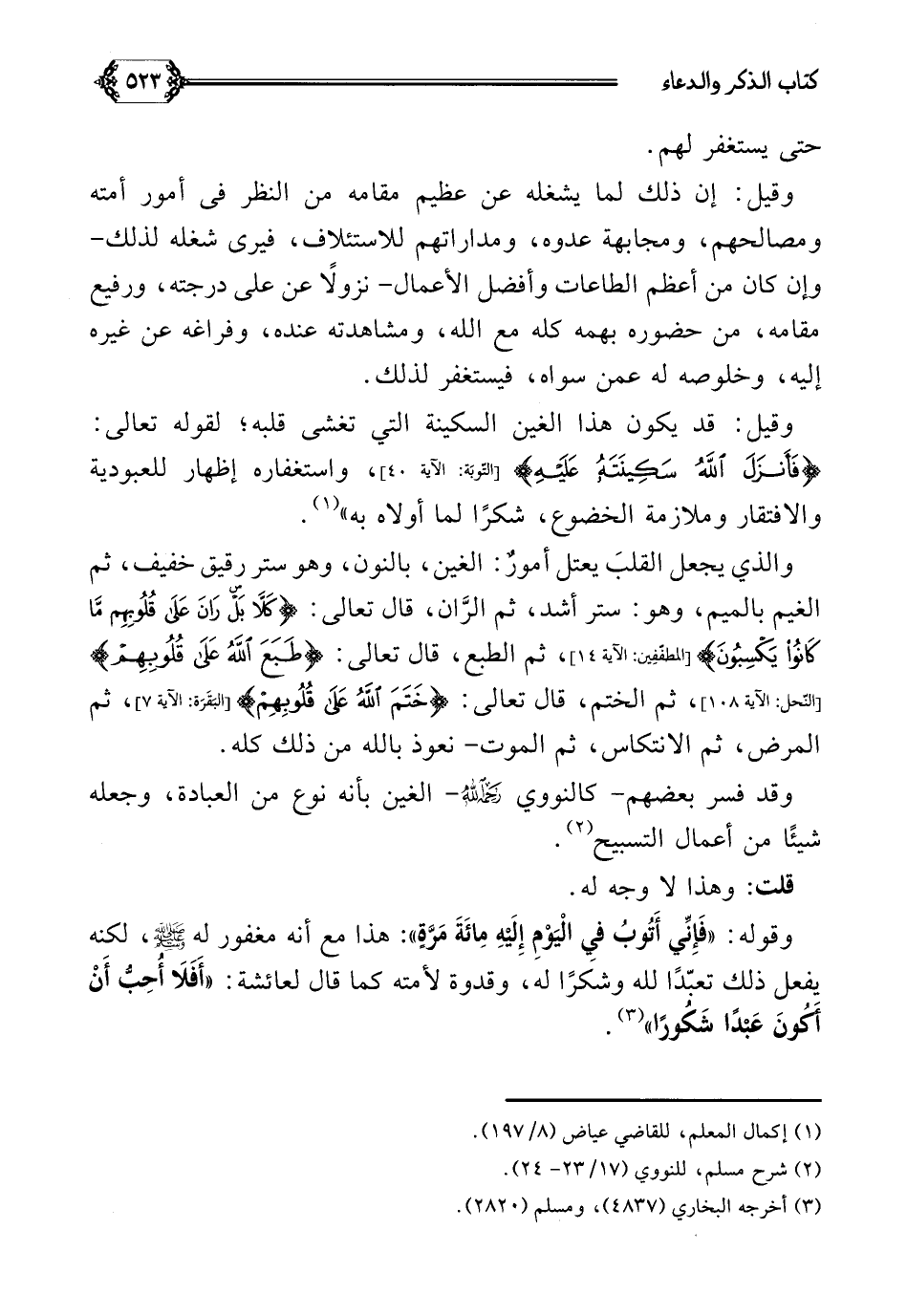 وقد فسر بعضهم- كالنووي رحمه الله- الغين بأنه نوع من العبادة، وجعله شيئًا من أعمال التسبيح (¬٢).