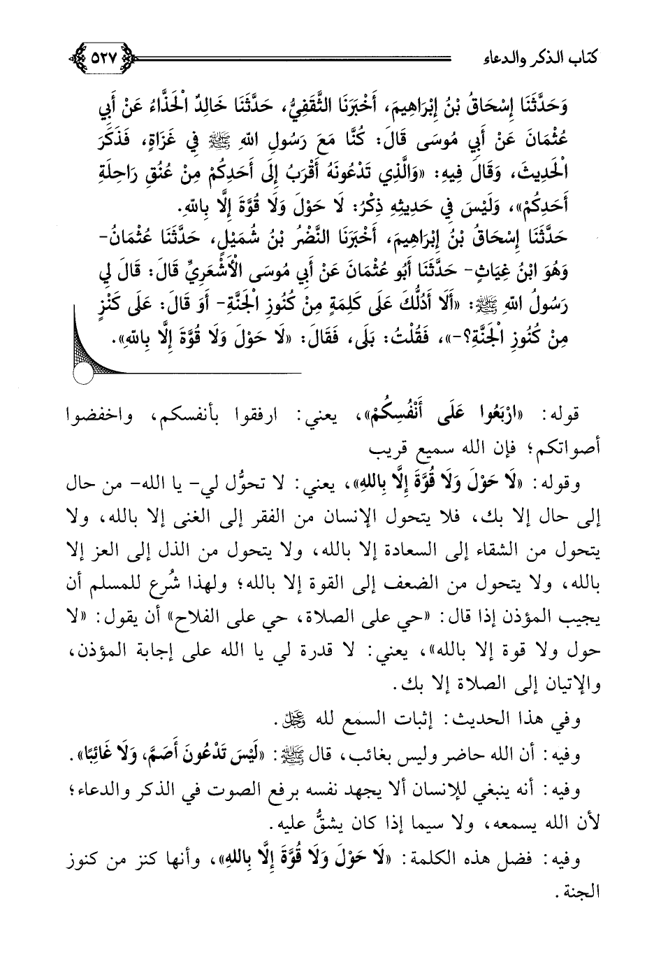 حَدَّثَنَا إِسْحَاقُ بْنُ إِبْرَاهِيمَ، أَخْبَرَنَا النَّضْرُ بْنُ شُمَيْلٍ، حَدَّثَنَا عُثْمَانُ- وَهُوَ ابْنُ غِيَاثٍ- حَدَّثَنَا أَبُو عُثْمَانَ عَنْ أَبِي مُوسَى الْأَشْعَرِيِّ قَالَ: قَالَ لِي رَسُولُ اللَّهِ صلى الله عليه وسلم: ((أَلَا أَدُلُّكَ عَلَى كَلِمَةٍ مِنْ كُنُوزِ الْجَنَّةِ- أَوَ قَالَ: عَلَى كَنْزٍ مِنْ كُنُوزِ الْجَنَّةِ؟ -))، فَقُلْتُ: بَلَى، فَقَالَ: ((لَا حَوْلَ وَلَا قُوَّةَ إِلَّا بِاللَّهِ)).