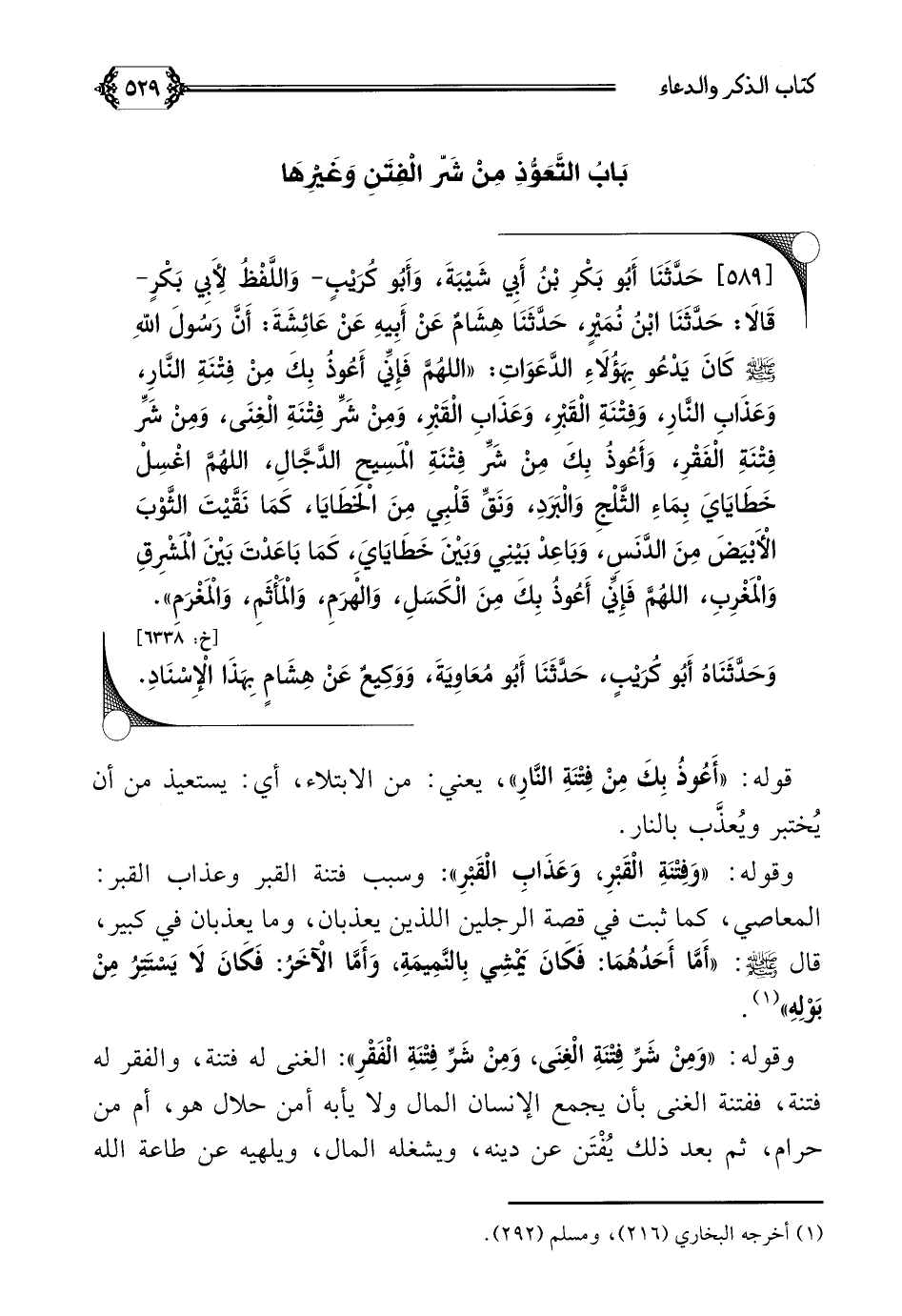 [٥٨٩] حَدَّثَنَا أَبُو بَكْرِ بْنُ أَبِي شَيْبَةَ، وَأَبُو كُرَيْبٍ- وَاللَّفْظُ لِأَبِي بَكْرٍ- قَالَا: حَدَّثَنَا ابْنُ نُمَيْرٍ، حَدَّثَنَا هِشَامٌ عَنْ أَبِيهِ عَنْ عَائِشَةَ: أَنَّ رَسُولَ اللَّهِ صلى الله عليه وسلم كَانَ يَدْعُو بِهَؤُلَاءِ الدَّعَوَاتِ: ((اللَّهُمَّ فَإِنِّي أَعُوذُ بِكَ مِنْ فِتْنَةِ النَّارِ، وَعَذَابِ النَّارِ، وَفِتْنَةِ الْقَبْرِ، وَعَذَابِ الْقَبْرِ، وَمِنْ شَرِّ فِتْنَةِ الْغِنَى، وَمِنْ شَرِّ فِتْنَةِ الْفَقْرِ، وَأَعُوذُ بِكَ مِنْ شَرِّ فِتْنَةِ الْمَسِيحِ الدَّجَّالِ، اللَّهُمَّ اغْسِلْ خَطَايَايَ بِمَاءِ الثَّلْجِ وَالْبَرَدِ، وَنَقِّ قَلْبِي مِنَ الْخَطَايَا، كَمَا نَقَّيْتَ الثَّوْبَ الْأَبْيَضَ مِنَ الدَّنَسِ، وَبَاعِدْ بَيْنِي وَبَيْنَ خَطَايَايَ، كَمَا بَاعَدْتَ بَيْنَ الْمَشْرِقِ وَالْمَغْرِبِ، اللَّهُمَّ فَإِنِّي أَعُوذُ بِكَ مِنَ الْكَسَلِ، وَالْهَرَمِ، وَالْمَأْثَمِ، وَالْمَغْرَمِ)).