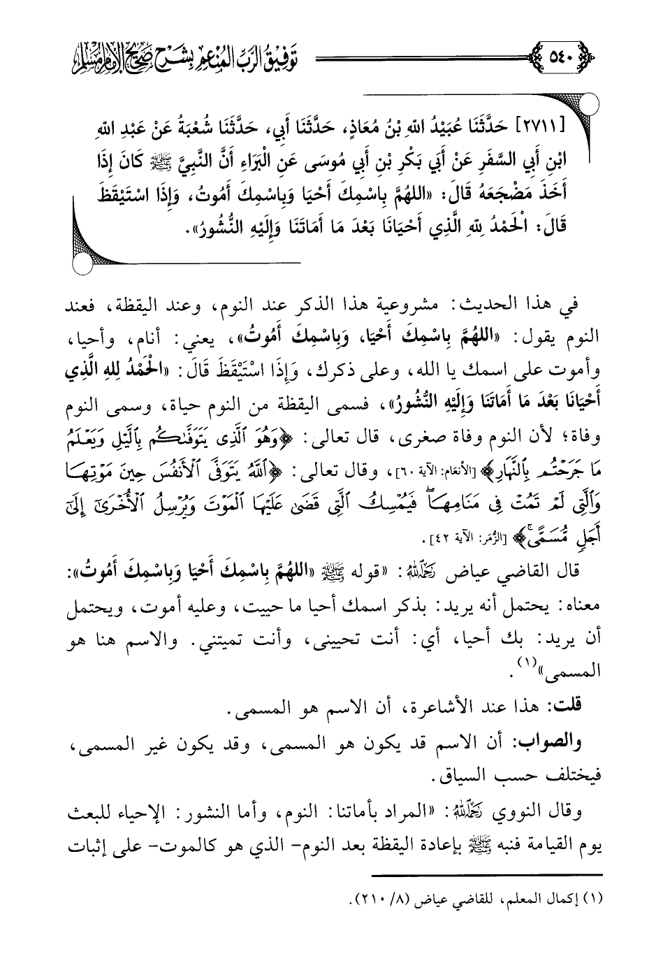 [٢٧١١] حَدَّثَنَا عُبَيْدُ اللَّهِ بْنُ مُعَاذٍ، حَدَّثَنَا أَبِي، حَدَّثَنَا شُعْبَةُ عَنْ عَبْدِ اللَّهِ بْنِ أَبِي السَّفَرِ عَنْ أَبَي بَكْرِ بْنِ أَبِي مُوسَى عَنِ الْبَرَاءِ أَنَّ النَّبِيَّ صلى الله عليه وسلم كَانَ إِذَا أَخَذَ مَضْجَعَهُ قَالَ: ((اللَّهُمَّ بِاسْمِكَ أَحْيَا وَبِاسْمِكَ أَمُوتُ، وَإِذَا اسْتَيْقَظَ قَالَ: الْحَمْدُ لِلَّهِ الَّذِي أَحْيَانَا بَعْدَ مَا أَمَاتَنَا وَإِلَيْهِ النُّشُورُ)).
