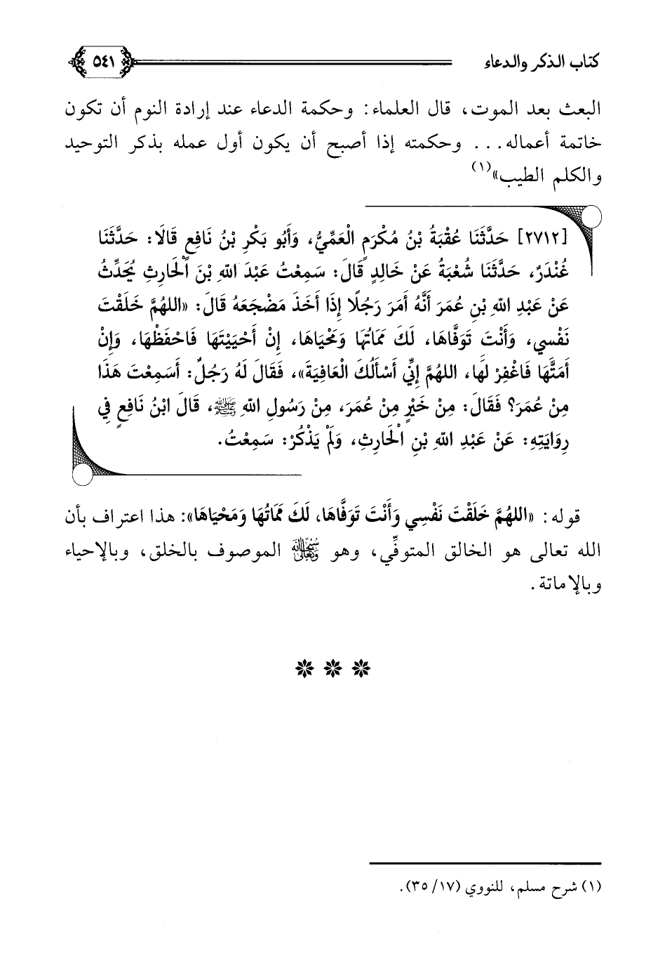 البعث بعد الموت، قال العلماء وحكمة الدعاء عند إرادة النوم أن تكون خاتمة أعماله ... وحكمته إذا أصبح أن يكون أول عمله بذكر التوحيد والكلم الطيب)) (¬١)